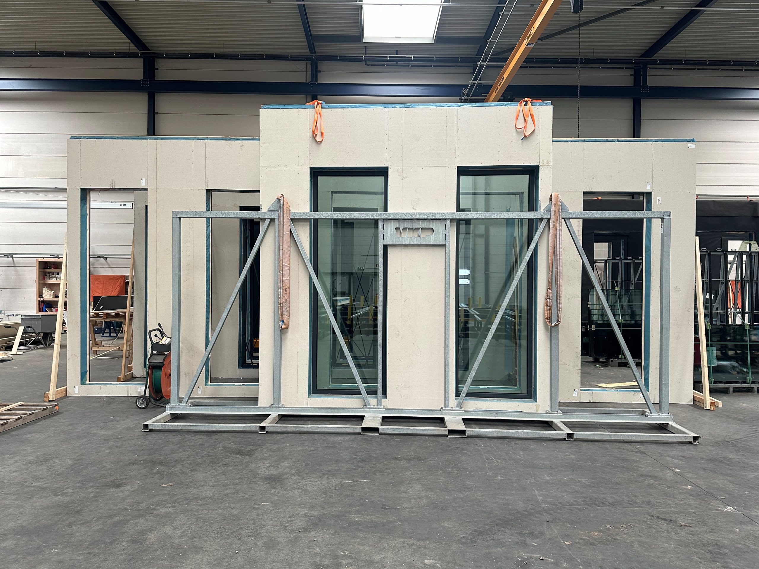 Ook is er gekozen voor houtskeletbouw, waarbij de buitenzijde wordt afgewerkt met houten sierlijsten en zonnepanelen. VKP leverde hiervoor de complete, gevelvullende elementen – rechtstreeks uit onze eigen fabriek. Deze elementen zijn volledig prefab en voorzien van aluminium kozijnen met glas. De gevelbekleding van het nieuwbouwdeel bestaat volledig uit zonnepanelen. Dankzij deze bouwmethode beperken we het aantal transportbewegingen én bouwen we efficiënter en milieuvriendelijker.