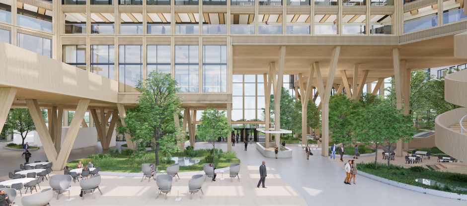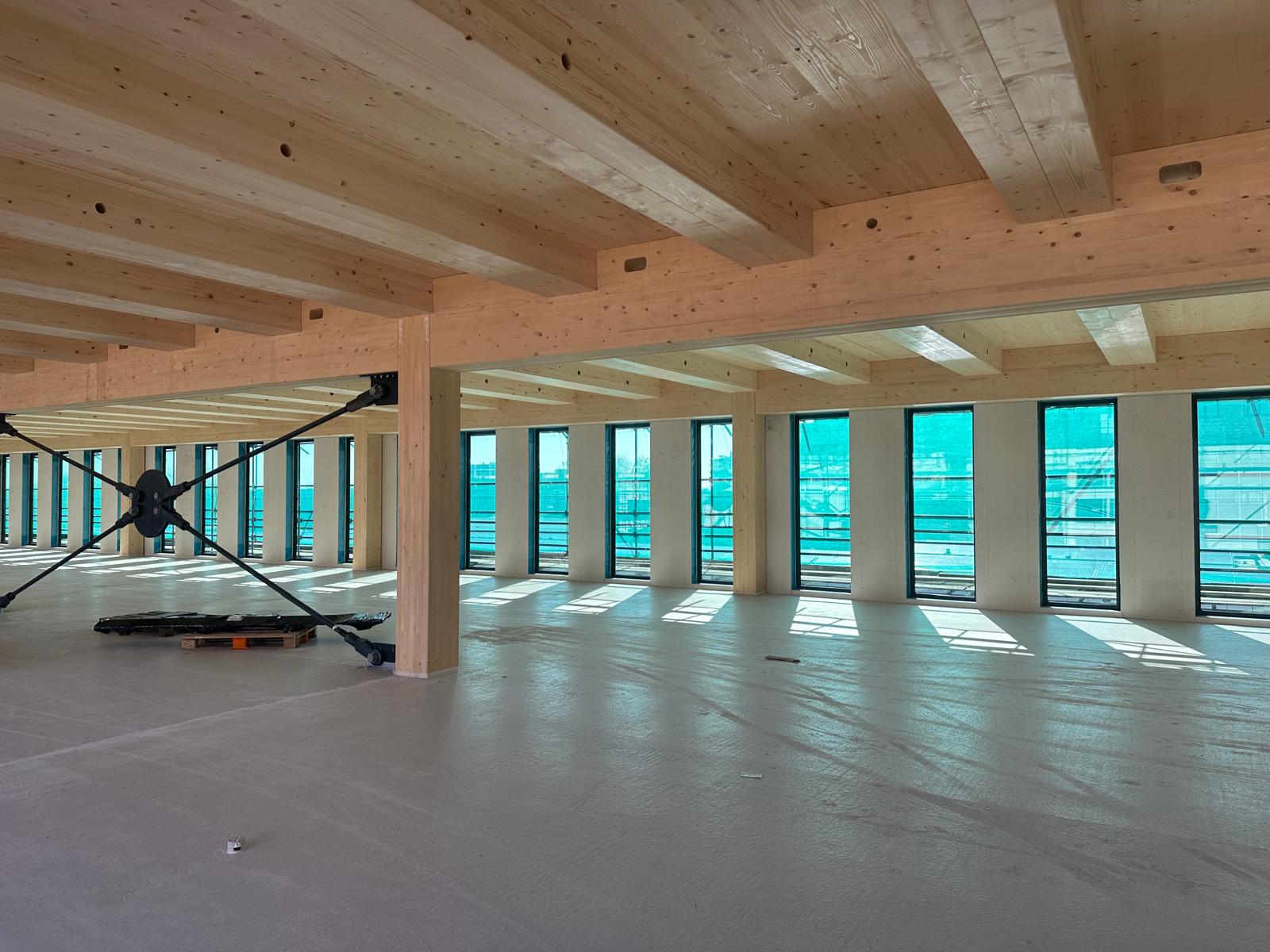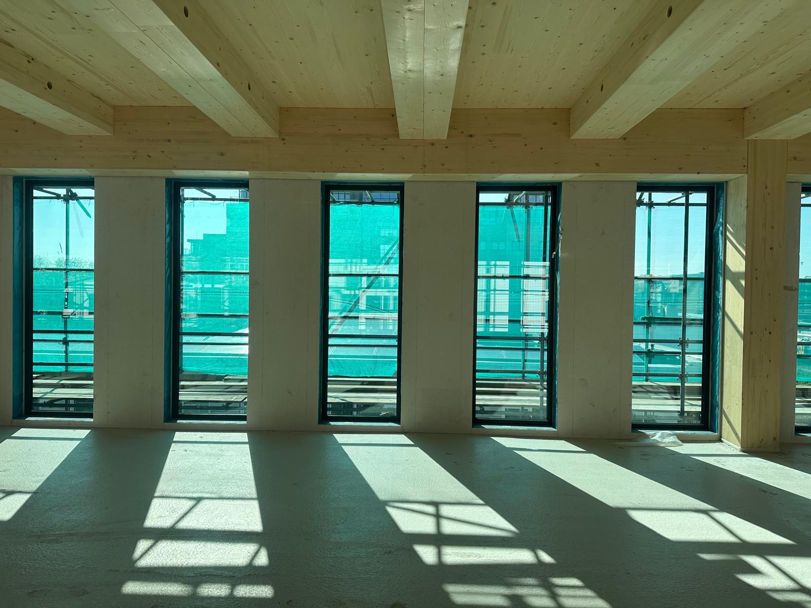 In Amsterdam, the existing ABN AMRO building is being transformed into a sustainable, inspiring workplace and meeting hub. Part of the structure is newly built using a CLT (cross-laminated timber) main supporting structure. The aim is to build according to Paris Proof standards, with maximum focus on circularity. Many materials from the original building – such as the raised computer floor – are being reused. Where new materials are needed, sustainable choices are made, including timber for the primary structure.