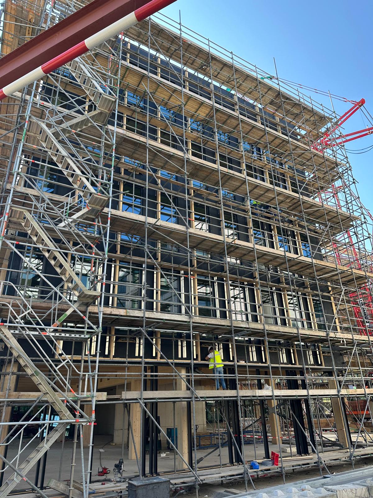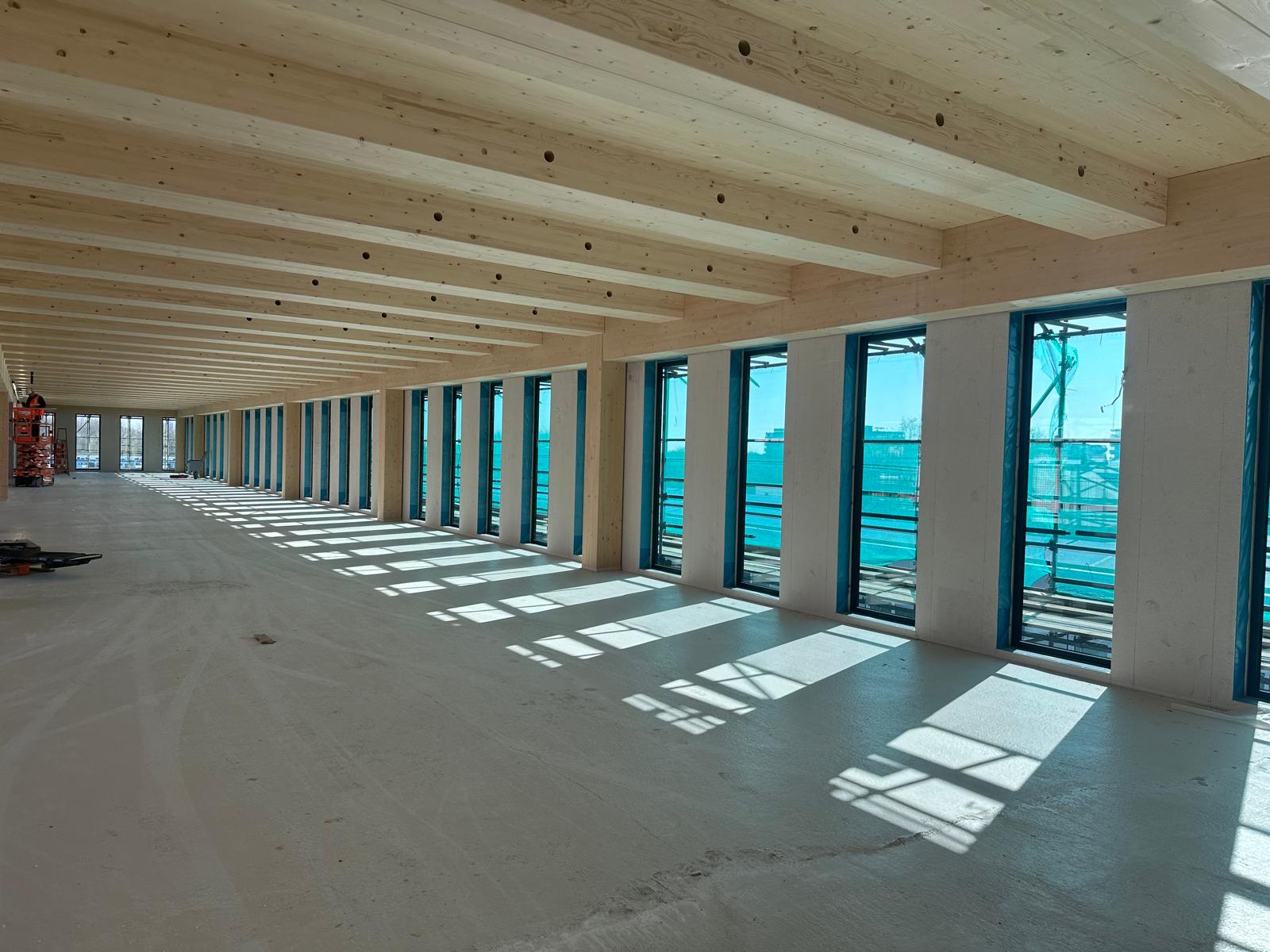 In Amsterdam wordt momenteel hard gewerkt aan een transformatie van het bestaande ABN AMRO-gebouw naar een duurzame, inspirerende werk- en ontmoetingsplek. Een deel van het pand wordt nieuw gebouwd en uitgevoerd met een CLT-hoofddraagconstructie. De ambitie: bouwen volgens de Paris Proof-norm, met maximale inzet op circulariteit. Zo worden materialen uit het bestaande gebouw – zoals de computervloer – hergebruikt. Voor nieuwe onderdelen wordt zoveel mogelijk gekozen voor duurzame materialen, waaronder de houten draagconstructie.