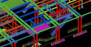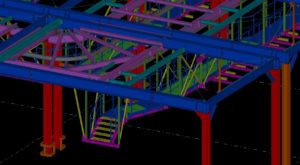 The support structure was designed as a frame structure, supported on concrete floor binding joists at a level of approx. 8 metres. The EHB track was suspended to the structure, together with the necessary hangers and walkaways, platforms for installations. The entire steel structure weighs 1503 tonnes.
