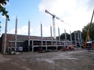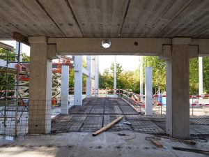 The lower floor is fully equipped as parking. The beams in the façade carry a steel blade system in the columns to meet the façade elements. The roof is equipped with IVH beams of 39.8m long.