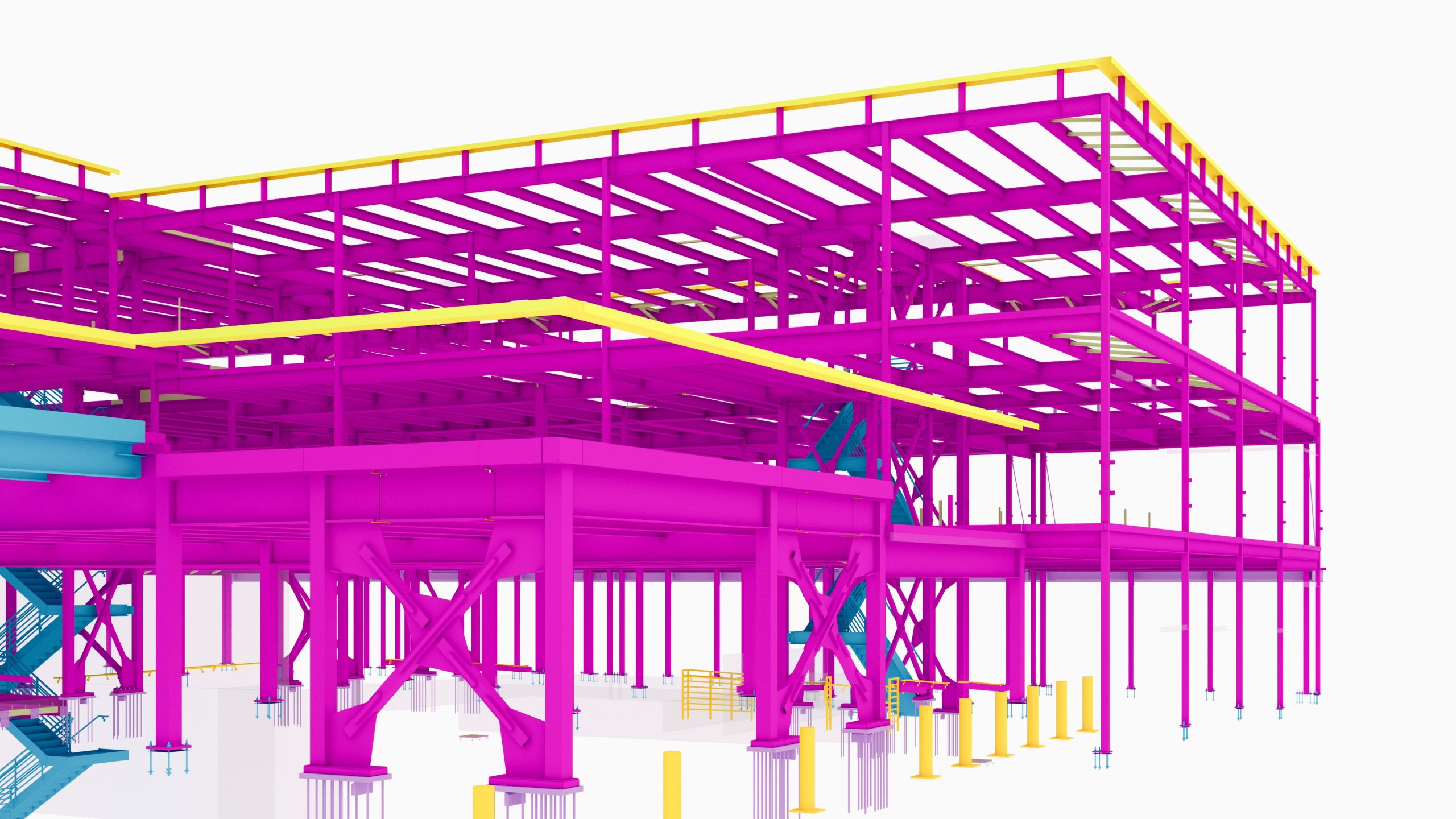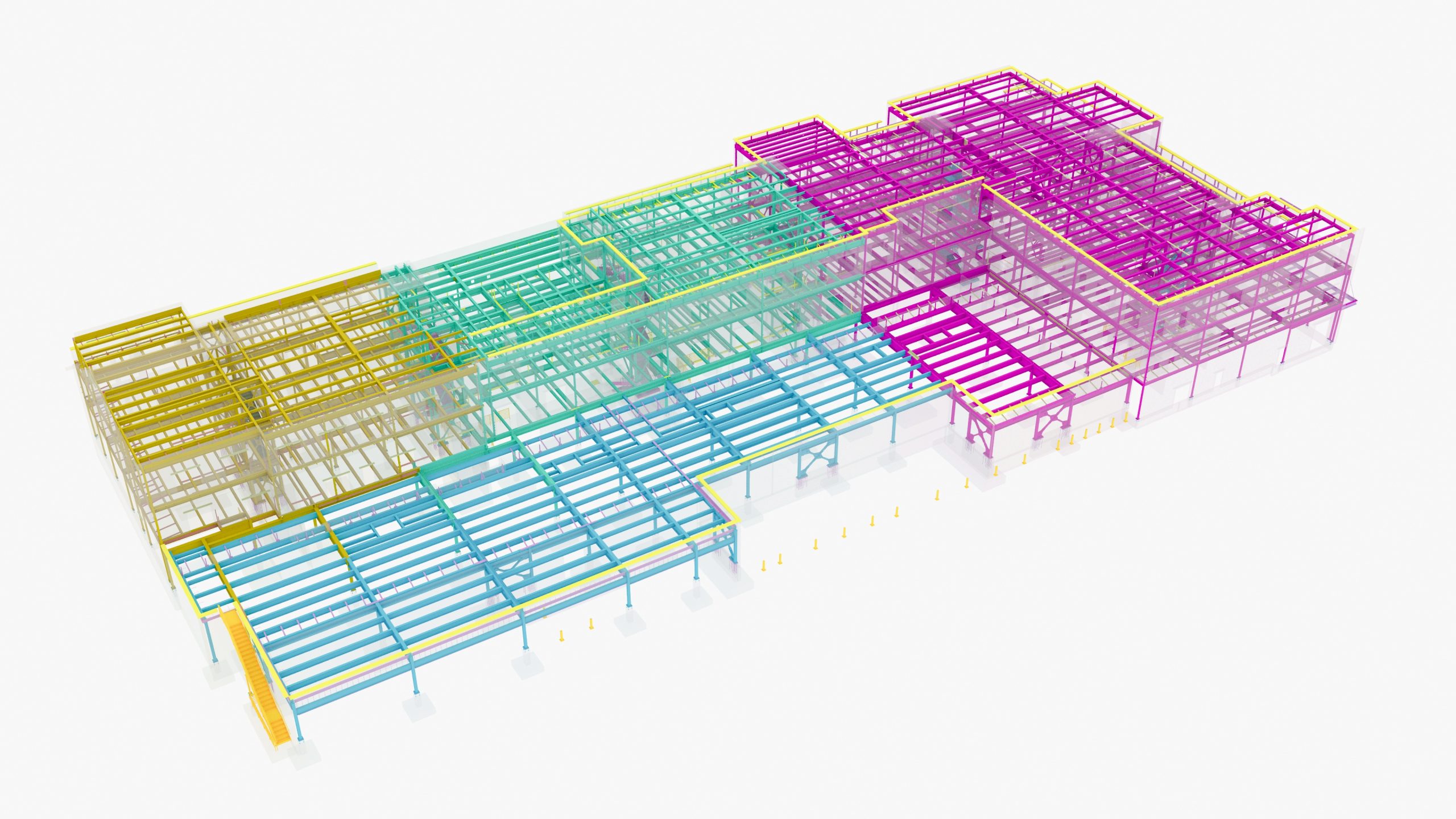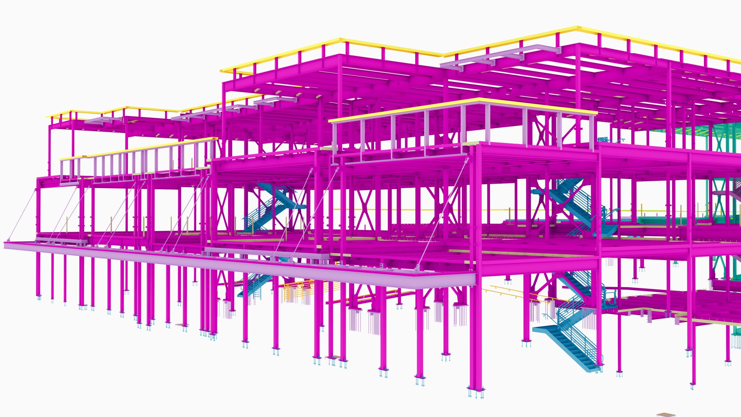 Projekt został w pełni zamodelowany i uszczegółowiony przy użyciu Tekla, a eksport modeli odegrał kluczową rolę w opracowaniu projektu we współpracy z inżynierami i architektem. Projekt stanowił szereg unikalnych wyzwań konstrukcyjnych, szczególnie ze względu na obecność podłóg o różnych wysokościach płyt. Jeden z bardziej złożonych aspektów obejmował detalowanie (6) stalowych wież schodowych, każda z podestami i balustradami schodowymi, a także schody z dwoma biegami z bramą. Z punktu widzenia detali, projekt obejmował kilka zaawansowanych i złożonych elementów konstrukcyjnych: