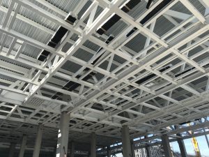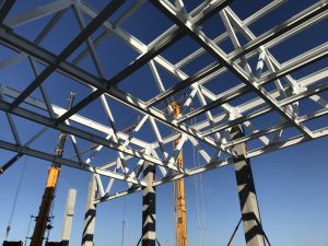 The special thing about this building is that its built on 30x concrete columns. Steel columns are mounted on these concrete columns, which support 34x steel trusses. The trusses at their turn support the entire steel structure