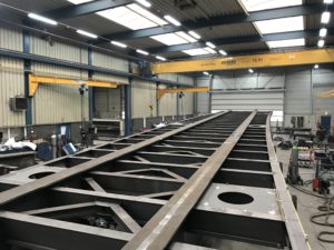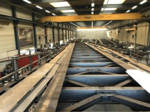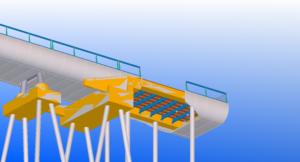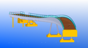 The main construction of the bridge sections consists of plategirders and rolled profiles, with connections between them. After manufacturing the parts, these are preserved and transported to the construction site. The columns are assembled into a V-shape.