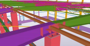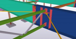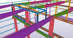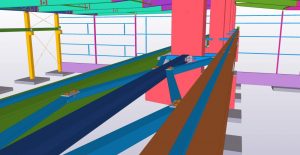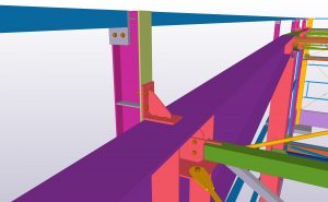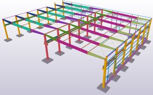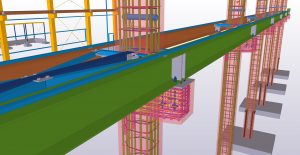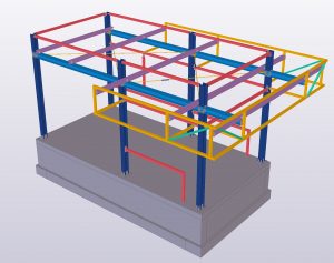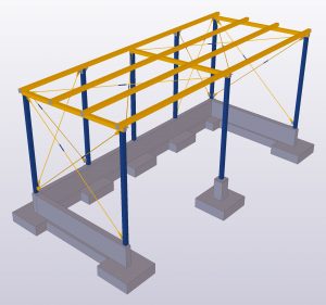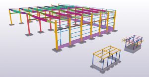 Teamtechnik Production Technology production building is two-nave construction with two cranes. The main construction is twelve precast columns which are supporting steel roof structure and crane girders. Roof plate girders are variable height; crane girders are designed from hot-rolled HEA profiles. During designing and modelling, Tekla BIMsight models with information were exchanged a lot of times between us, architects and crane girders distributors. Besides production building we designed and modelled two steel constructions – rubbish shed and gatehouse.