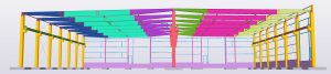 Budynek produkcyjny firmy teamtechnik Production Technology Sp. z o.o. to dwunawowa hala przemysłowa, w której zaprojektowano dwie suwnice. Konstrukcję główną budynku stanowią prefabrykowane słupy żelbetowe, które wspierają stalową konstrukcję dachu oraz belki podsuwnicowe. Konstrukcja dachu składa się z dźwigarów blachownicowych o zmiennej wysokości przekroju oraz tężników rurowych i kratowych. Belki podsuwnicowe zaprojektowano z profili gorącowalcowanych HEA osadzonych na wspornikach słupów prefabrykowanych. W trakcie projektowania i tworzenia modelu wielokrotnie zostały wymienione informacje oraz modele Tekla BIMsight z branżami architektoniczną czy instalacyjną, z dostawcą suwnic oraz stolarki okiennej i drzwiowej. Wraz z halą produkcyjną zostanie wybudowany budynek biurowo-socjalny w konstrukcji murowo-żelbetowej. Obok budynku powstanie wiata na odpady komunalne i budynek stróżówki.