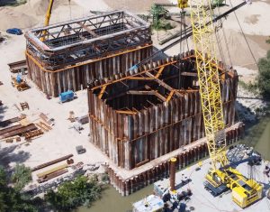 As the construction of the bridge branches progressed, in order to support them, we planned 2-2 additional temporary support for each branch in the riverbed from the piers towards the shore. These supports were built on steel piles that were installed into the bottom of the riverbed, one has 3×5 piles and the other 3×4+1 piles. The additional height of the structure above the piles is 11 meters. The design of the upper part is similar to the previous supports.