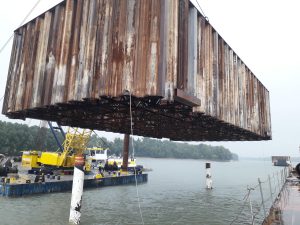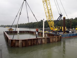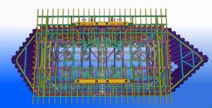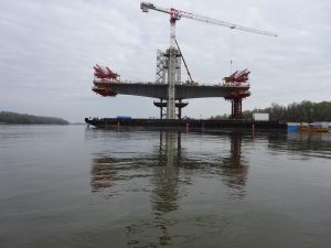 Our task begin with the design of the structures of the cofferdam structures installed in the bed of the Danube, which during construction ensure the construction of the foundation of the bridge, and then provide space for the construction of the ascending structures of the pillars and the scaffolding below the water level, within the boundary walls, forming a dry workspace. The cofferdam structures were intsalled into the riverbed from two units, a lower crust element and an upper guard wall element. The weight of the structures are155 and 185, a total of 340 tons.