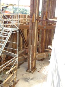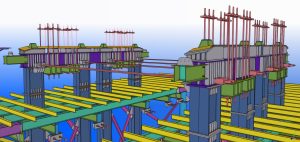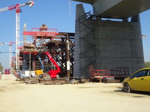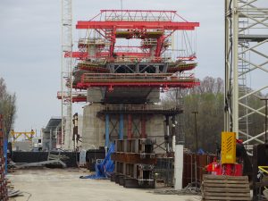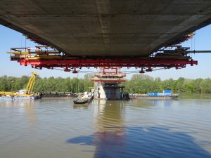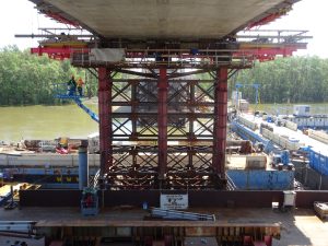 Each one of these is made for stabilizing the formwork of the starting units, starting from the piers and the first section of the bridge branches to be built with the balance technology. The pillars of the structure were built on pile cups, the columns are made of double HE-B 800, four an each side of the pillar, the height of the structure is 18 meters. The upper load-distributing transversal support is double HE-B 700 reinforced with longitudinal ribs and diaphragms. Above this, there are angled stools are placed perpendicular to the bridge axis ,which adjust the shape of the bridge structure.