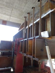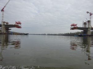 The main bridge is being built from both directions, also from the shore, so in addition to the previous ones, at each end of the bridge, one additional temporary support is being prepared to support the bridge sections to be built there. Here the supporting structure is made up 35+2 columns, which are bracing wiht U profile beam. The steel structure of the bridge is supported on two sides paralell to the bridge axis, the middle part supports the bottom plate of the bridge structure with ID-15 racks.