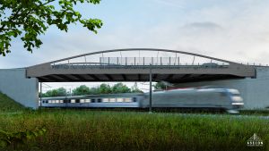 The structure is designed as a single simply-supported span, composite slab-beam system (Langer’s girders). Steel box girders of variable height are reinforced with steel arches and connected by steel I-section cross-beams acting compositely with the reinforced concrete deck slab. The span is supported by pot bearings on reinforced concrete abutments. The abutments in turn are supported indirectly by the drilled CFA piles, which were chosen on order to minimize vibrations during construction due to the vicinity of the railway infrastructure.
