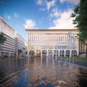 The OCC is the final piece of the Haagse Loper in the Spuikwartier and provides connections in the city of The Hague. For those who follow the Turfmark route from Central Station, the Turfplaza is created at the place where the City Hall and OCC meet. At the Turfplaza there is one of the various entrances that the OCC will get. The surrounding walking areas remains a clear walkingroute up to the Spuiplein that connects various squares. The dynamic character of the street is strengthened here with a varied range of shops and restaurants and an informal stage that forms the entrance hall of the OCC. This makes it a pleasant place to stay for both the citizens of The Hague and for visitors to the city.