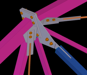 Przesłany model jest zwieńczeniem mojego projektu inżynierskiego. Zaprezentowany obiekt to stalowy hangar dużej rozpiętości. W toku projektowania zwymiarowane zostały – rama kratownicowa, podstawa słupa, styki montażowe oraz płatwie, schemat stężeń został obliczeniowo uwzględniony, natomiast nie zwymiarowano ich przekrojów. Na podstawie geometrii modelu wykonana została (niepełna) dokumentacja warsztatowa rysunków projektowanych elementów (część ze sporządzonych rysunków została załączona w zgłoszeniu konkursowym).
