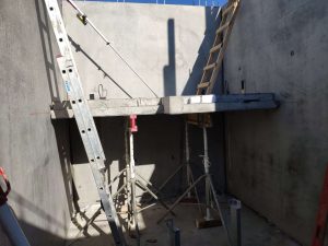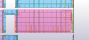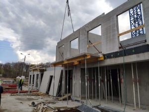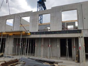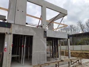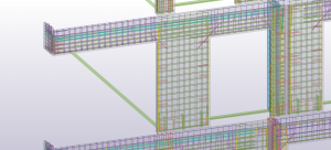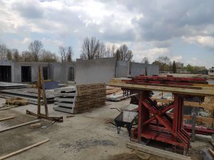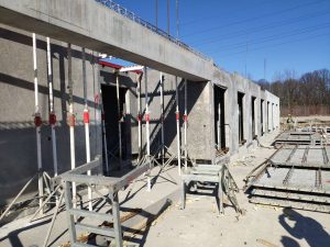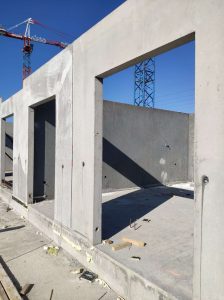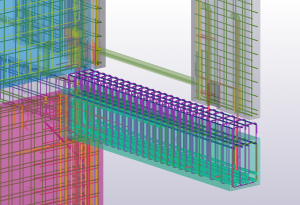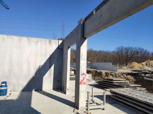 Konstrukcja monolityczna, którą stanowią belki łączy się z konstrukcją prefabrykowaną za pomocą wytyków wchodzących w rury umieszczone w prefabrykowanych ścianach. Na belkach opierają się wszystkie ściany nośne, przez co ich przekrój jest bardzo duży. Dzięki modelowi 3d w prosty sposób kontrolowaliśmy wszystkie rzędne dolne belek, aby ułatwić rozprowadzenie wszystkich potrzebnych instalacji.