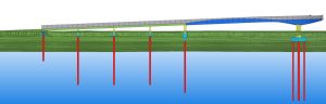 The existing environment and the 3D alignment has been drawn in Civil 3D. This data was used in Rhino 6 and Grasshopper to build the other geometry around it. This geometry and data was then used in the calculation model in SOFiSTiK, but also in Tekla to generate the steel bridge, the complete reinforcement, pile foundation and formwork. By working with 1 central model, adjustments can be made to the design very quickly.