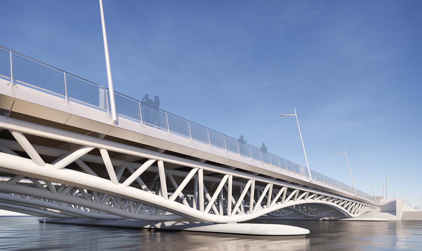 The work includes the construction of two new bridges, two pavilions, and the entrance to a parking facility (P&R), with specific attention to visual quality. Each bridge is composed of three separate sections, with the central one designated for tram and bus lanes. Bridges 2060 (Annemie Wolff Bridge) and 2080 (Lee Miller Bridge), known as island bridges, are located in open water and connect Haveneiland, Centrumeiland, and Strandeiland. They are crucial for the smooth flow of car, bicycle, and tram traffic. All bridges also include features for wildlife, such as special nesting areas for bats and birds, and safe crossing options for small animals.