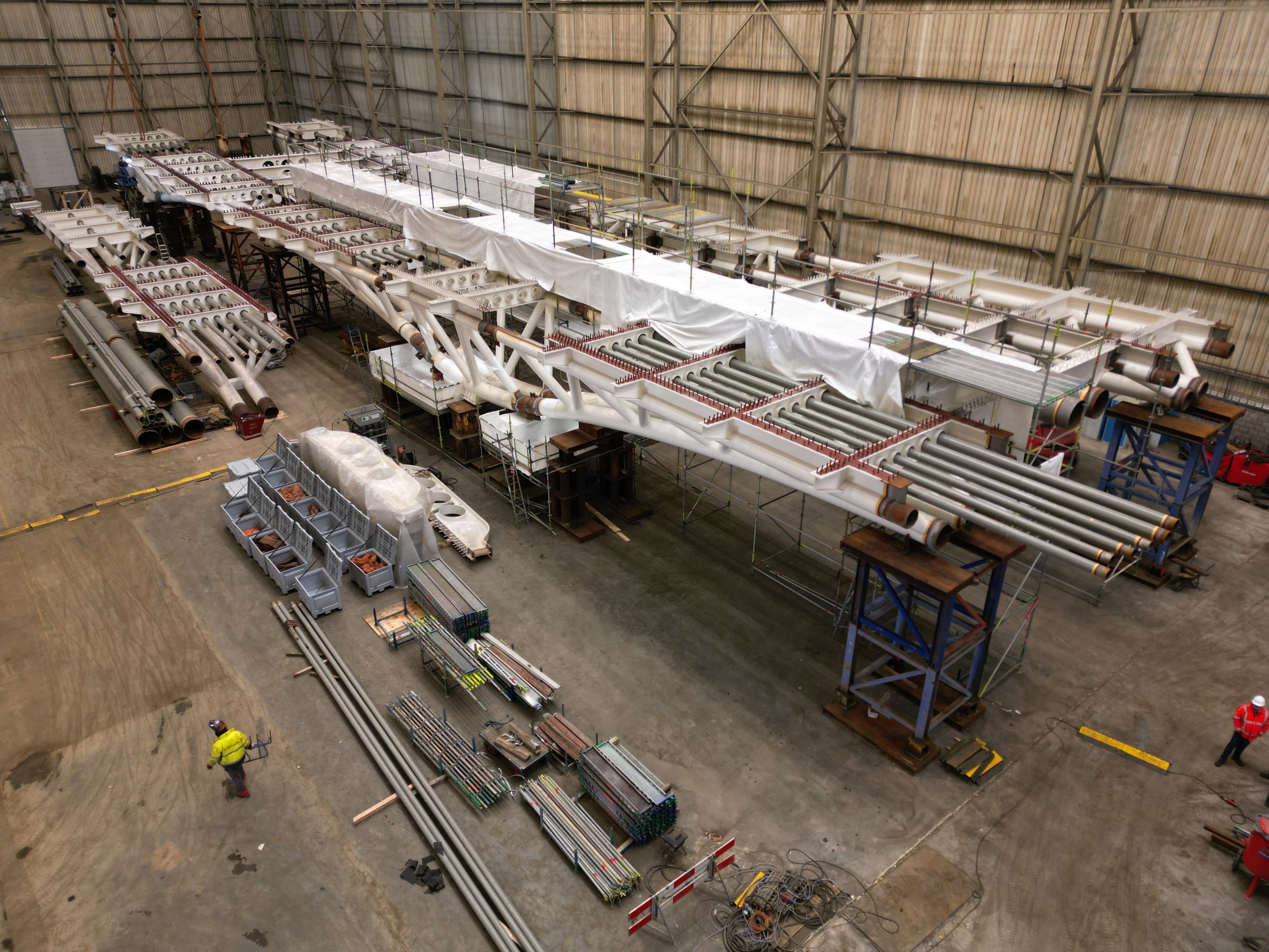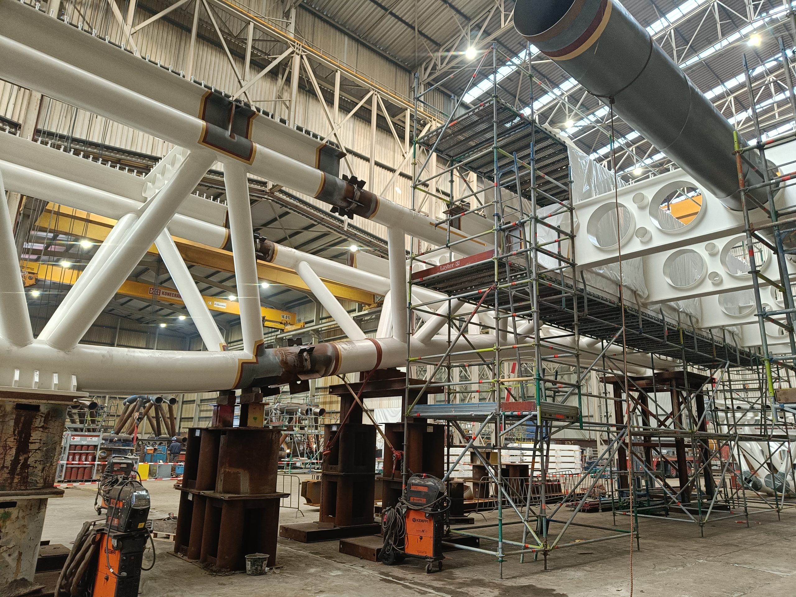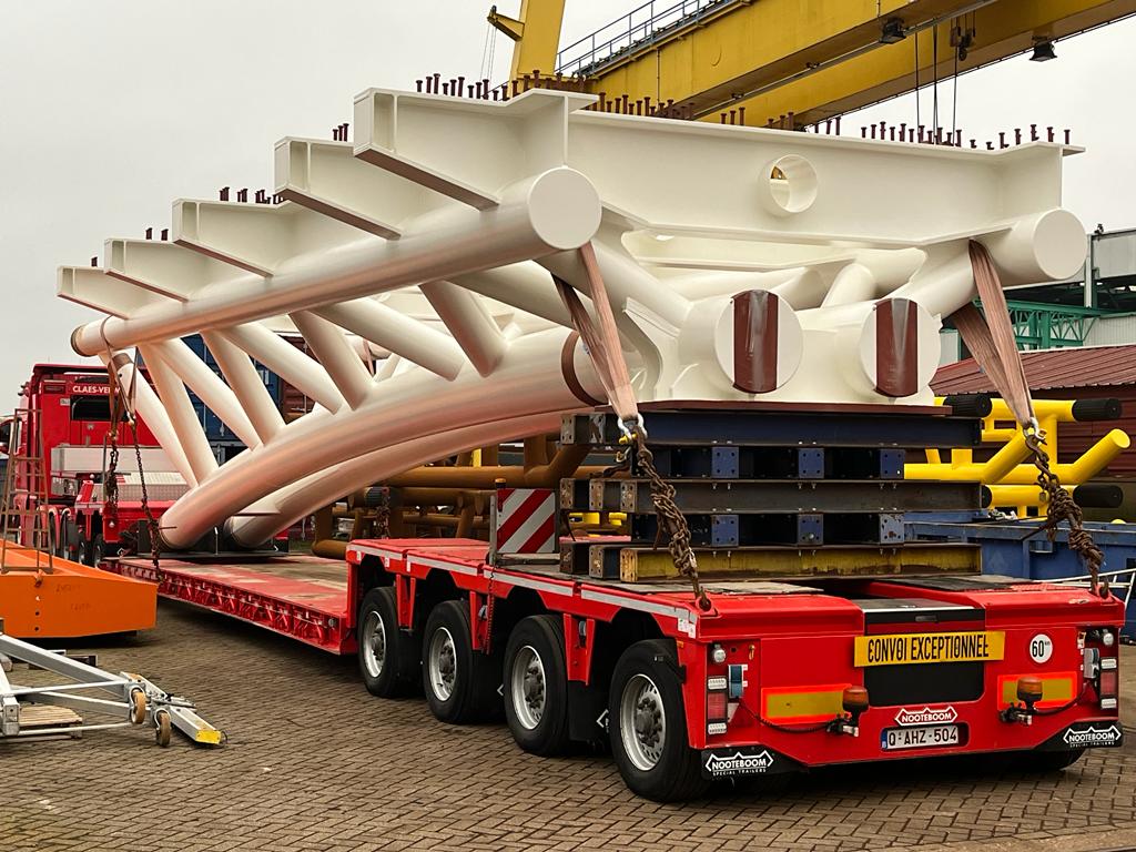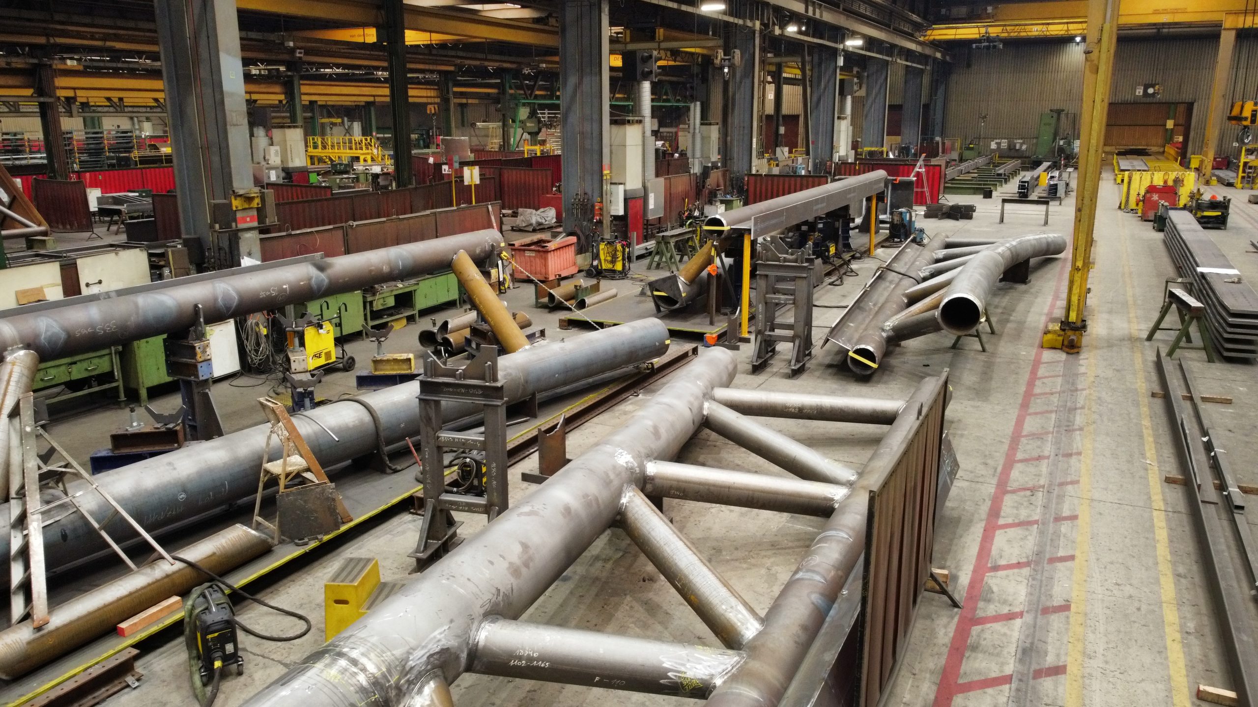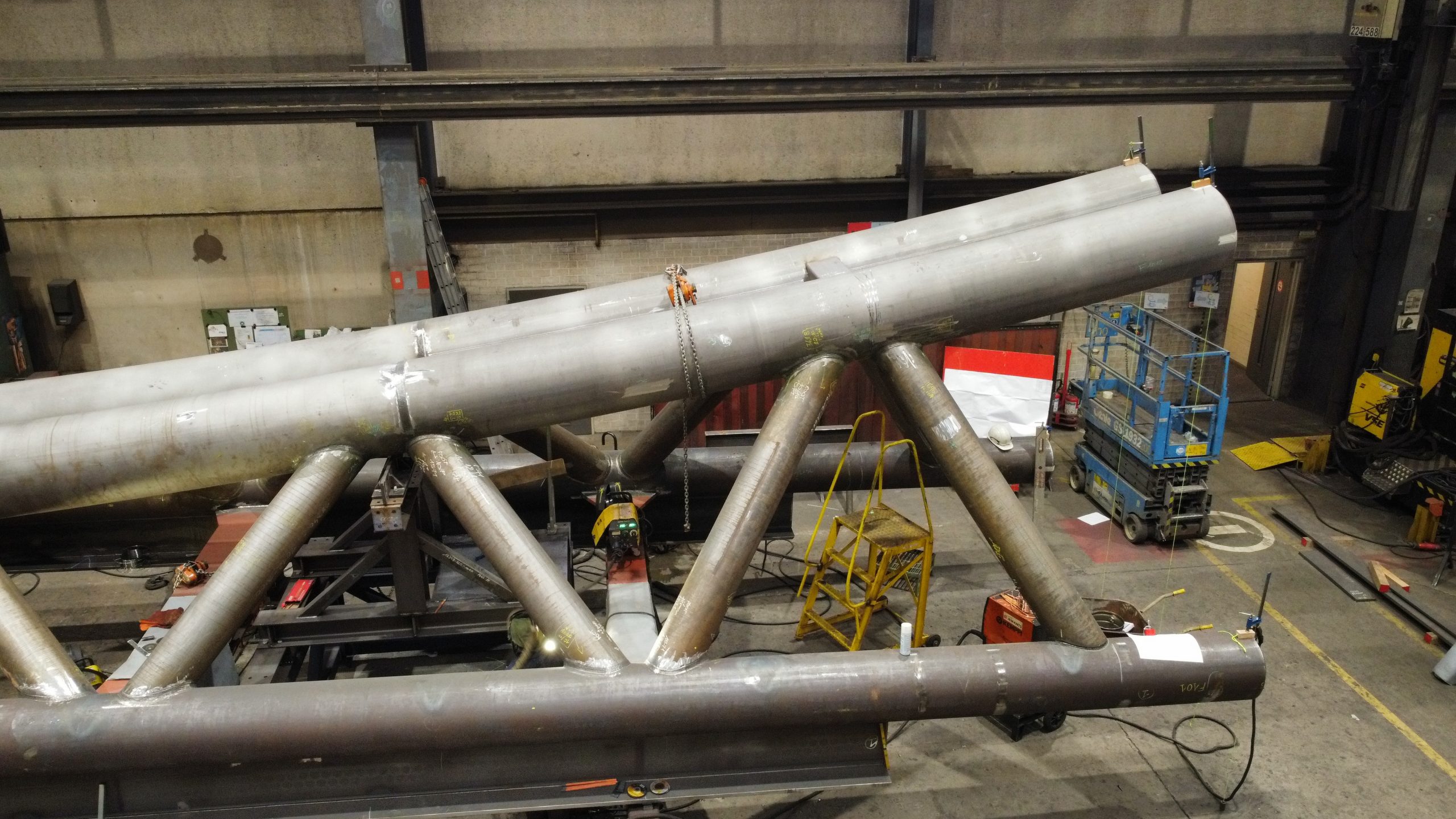 Voor het inductie buigen van de grote stalen buizen (diameter 610 mm en dikte 40 mm) hebben we een beroep gedaan op Kersten. Deze opdracht vereiste uiterste precisie en technische slagkracht. Dankzij hun unieke machinecapaciteiten en een gespecialiseerde buigtechniek, die allesbehalve alledaags is, slaagde Kersten erin de buizen exact volgens specificatie te vervormen. Dit project benadrukt het uitzonderlijke karakter van de opdracht, waarbij ongekende formaten gebogen moesten worden en de techniek tot op het randje van de maakbaarheid is getest. Voor het op maat snijden van de buizen die gebruikt werden voor de diagonale verbindingen, die stuk voor stuk verschillende afmetingen en hoeken hadden, hebben we gebruik gemaakt van de buis NC-bestanden. Deze bestanden bevatten de exacte snij-instructies en zijn rechtstreeks ingeladen in onze buissnijmachine. Dankzij deze geautomatiseerde aanpak konden we met hoge precisie en efficiëntie de complexe vormen en variaties in de buizen realiseren, wat essentieel was voor een correcte montage en een stevig eindresultaat.