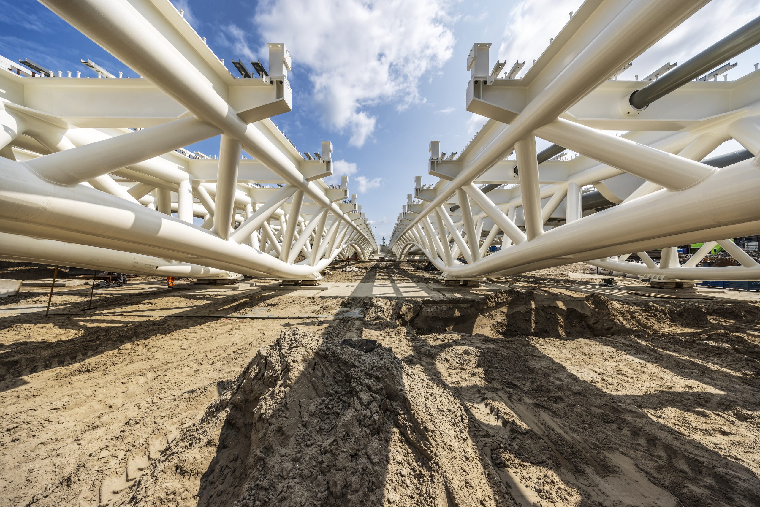 Walking underneath the bridges, the refined lines of the steel structure immediately stand out. The curved steel tubes form the main structure and give the bridge its characteristic shape. Between these arches, straight diagonal tubes are placed, which not only provide additional stability but also contribute to the rhythmic and aesthetic pattern of the whole. Beneath the roadway are straight girders that distribute the load and add extra strength to the bridge. These girders include openings for continuous conduit pipes, neatly and safely integrating utilities. This smart combination of form and function demonstrates how technical complexity and architectural elegance can go hand in hand.