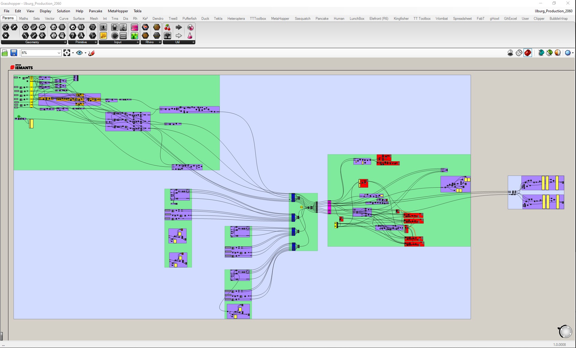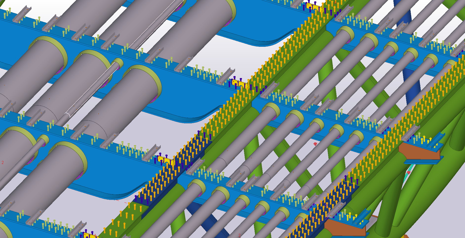 Voor het opstellen van het 3D-model is gebruikgemaakt van Rhino/Grasshopper. Vertrekkend van een 2D-assenplan werd dit plan omgezet naar een 3D-model, dat vervolgens via de Tekla Live Link werd geïmporteerd in Tekla. De grootste uitdaging lag in het verwerken van de zeeg: de gebogen buizen moesten herleid worden tot boogsegmenten, zodat inductiebuigen technisch haalbaar bleef. Met één script zijn alle zes bruggen afzonderlijk omgezet van een 2D-tekening naar een volledig 3D Tekla-model, klaar voor verdere uitwerking tot werkhuistekeningen. Later zijn er ook nog details toegevoegd aan de hand van aparte Grasshopper scripts.