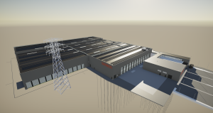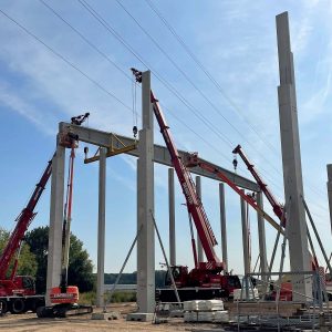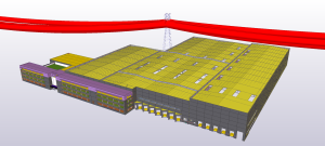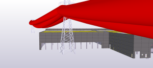 Een grote uitdaging bij dit project waren de hoogspanningsleidingen die over het nieuwe bedrijfsgebouw verlopen. We hebben deze in Tekla gemodelleerd op basis van 2D-tekeningen van de transmissienetbeheerder. Om de positie van de hoogspanningsleidingen te kennen, werd rekening gehouden met de verschillende mogelijke weersomstandigheden welke hierop invloed hebben. Daar bovenop werd een gevarenzone met een diameter van 7 tot 9 meter, afhankelijk van welke leiding, rond deze leidingen in rekening gebracht. Op deze wijze konden we waarnemen welke prefab elementen met behulp van speciale technieken dienden gemonteerd te worden. Een specifiek voorbeeld hiervan is een voorgespannen ligger van 40 m lang die 40 Ton weegt, waarvoor we een hijsjuk hebben ontworpen. De ligger werd met maar liefst drie kranen gemonteerd. Zodoende konden we het aanslagpunt onder het spant brengen, waardoor de kranen zich nipt niet in de gevarenzone rond de hoogspanningskabels bevonden.