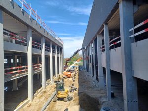 A major challenge with this project was the high-voltage power lines that run across the new building. We modeled these in Tekla based on 2D drawings from the transmission system operator. In order to know the position of the high-voltage cables, the various possible weather conditions affecting them were taken into account. A danger zone with a diameter of 7 to 9 meters, depending on which cable, was also taken into account around these cables. In this way we could determine which prefabricated elements had to be assembled using special techniques. A specific example of this is a prestressed beam with a length of 40 m and a weight of 40 ton for which we designed a lifting yoke. The beam was assembled using three cranes. This enabled us to bring the lifting point under the beam, so that the cranes were just outside the danger zone around the high-voltage cables.
