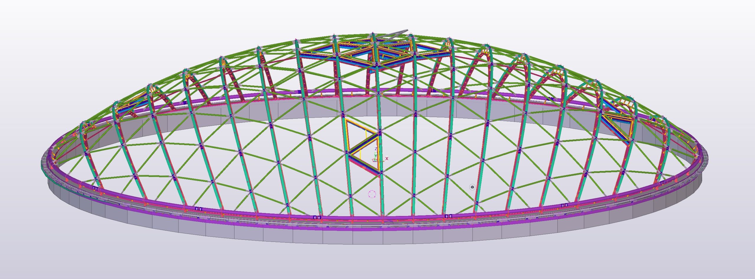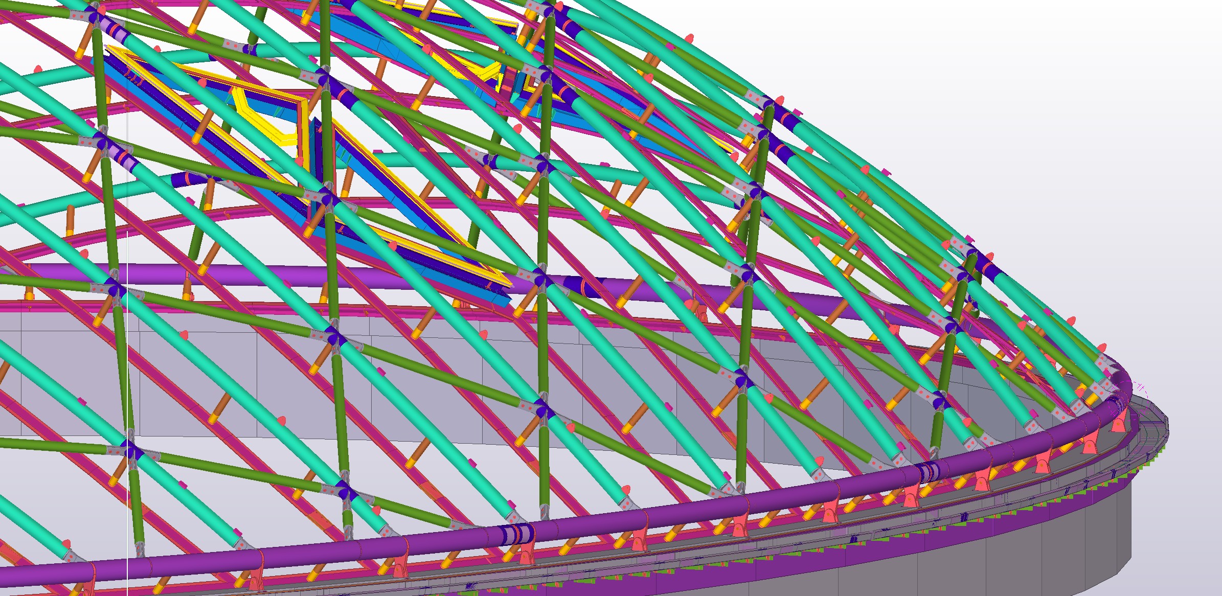 W projekcie kluczową rolę odegrało zastosowanie oprogramowania Tekla Structures, które znacznie usprawniło cały proces projektowania, produkcji oraz montażu konstrukcji. Dzięki zaawansowanym funkcjom tego narzędzia, w szczególności komponentom parametrycznym, możliwe było stworzenie bardzo dokładnego modelu 3D kopuły, co miało istotny wpływ na efektywność realizacji projektu. Tekla Structures umożliwiło pełną synchronizację między projektem a procesem produkcyjnym, dzięki czemu montaż przebiegł sprawnie i zgodnie z harmonogramem.