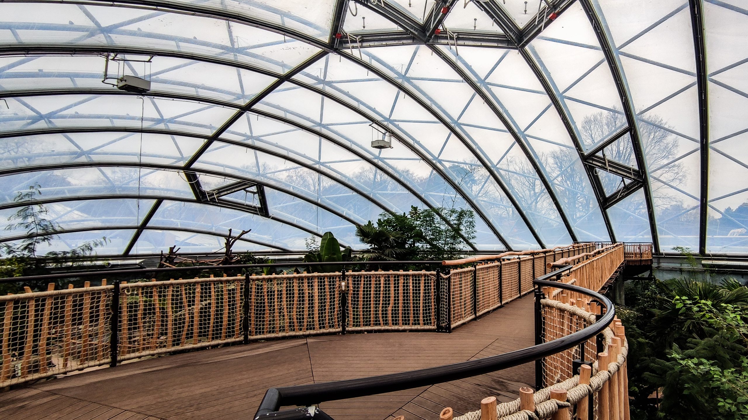 Meranti-Halle is a modern tropical pavilion at Allwetterzoo Münster in Germany, which opened in June 2023. It was designed as an eco-friendly educational and recreational facility where visitors can admire over 15 species of exotic animals. The hall has an area of 2500 m² and a height of 20 meters, and its structure includes a steel dome with a suspended ETFE foil covering that ensures optimal lighting and thermal conditions.