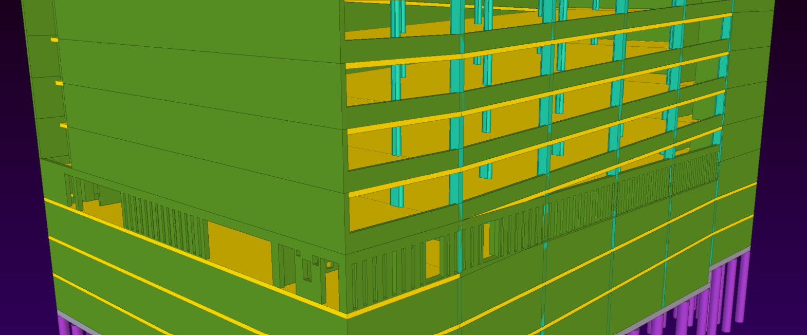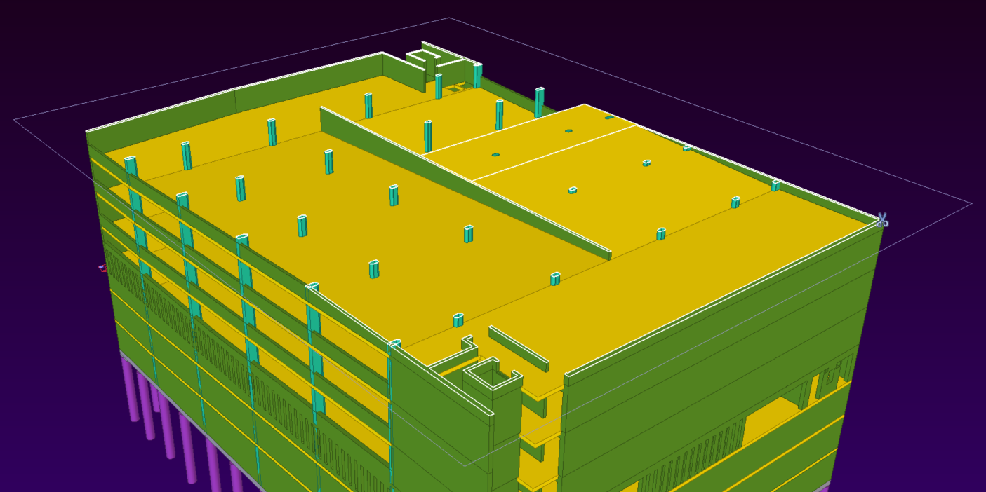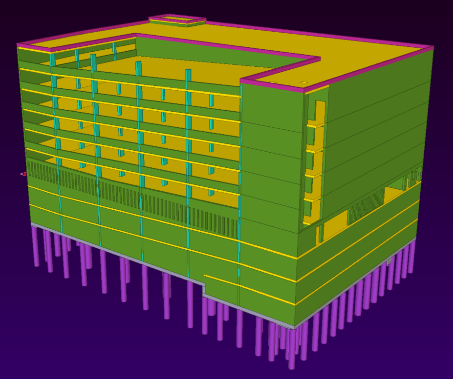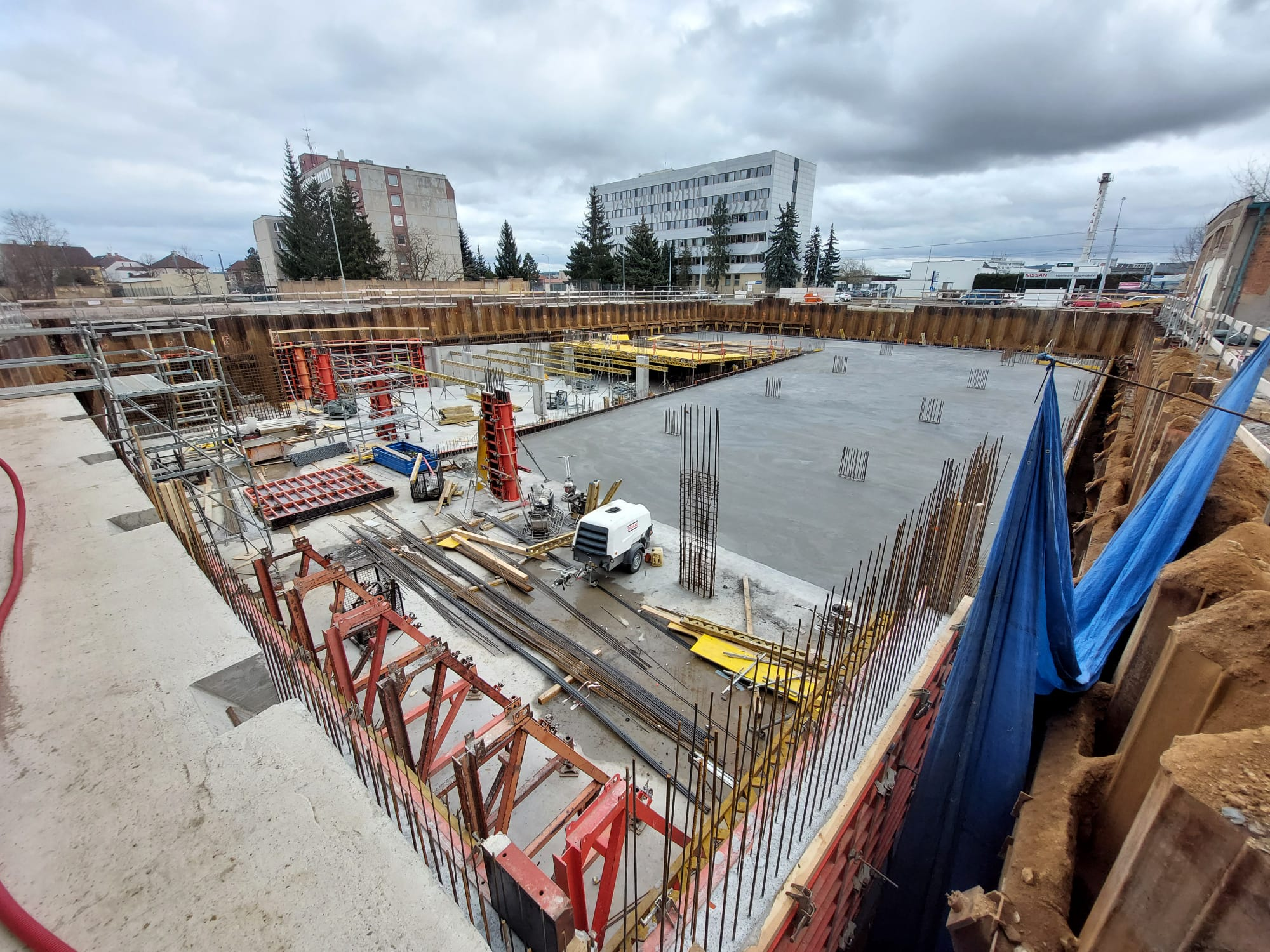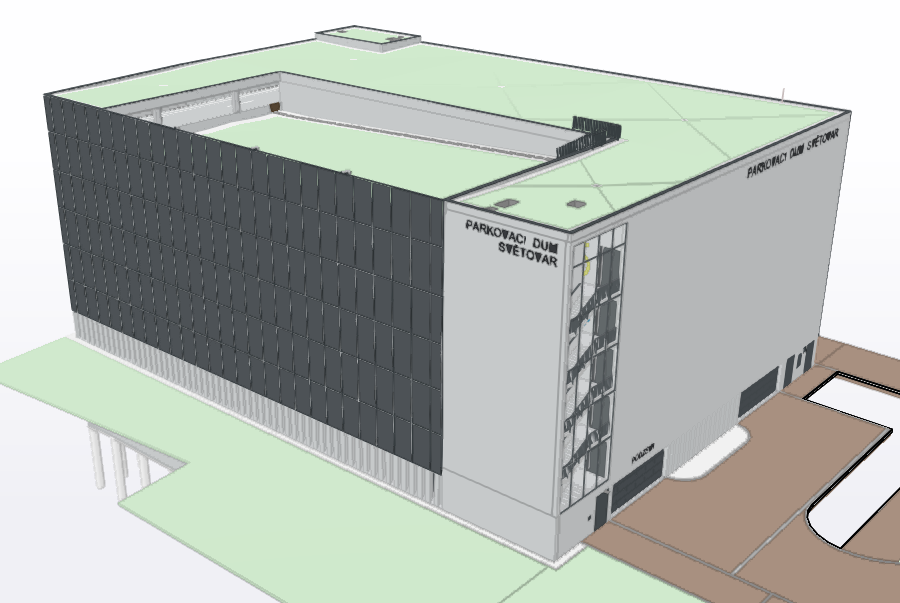 The building is located in the built-up area of the city of Pilsen in the area of the former Světovar brewery located on the border of the residential and industrial zones of the Slovany district. The parking house with three underground floors and five above-ground floors with a total capacity of 433 parking spaces. The floor plan dimensions are 49 m x 34.5 m, the volume of reinforced concrete is approximately 6300 m3. The supporting structure is designed as a reinforced concrete skeleton with reinforcing perimeter walls in the transverse direction and reinforcing walls in two opposite corners, where the staircase and elevator shafts are located. The 270 mm thick, beamless ceiling slab rises in a spiral and allows parking even on sloping surfaces. The columns are arranged in a module of 8.1 x 7.6 m. The building is based on piles with a cooperating foundation slab.
