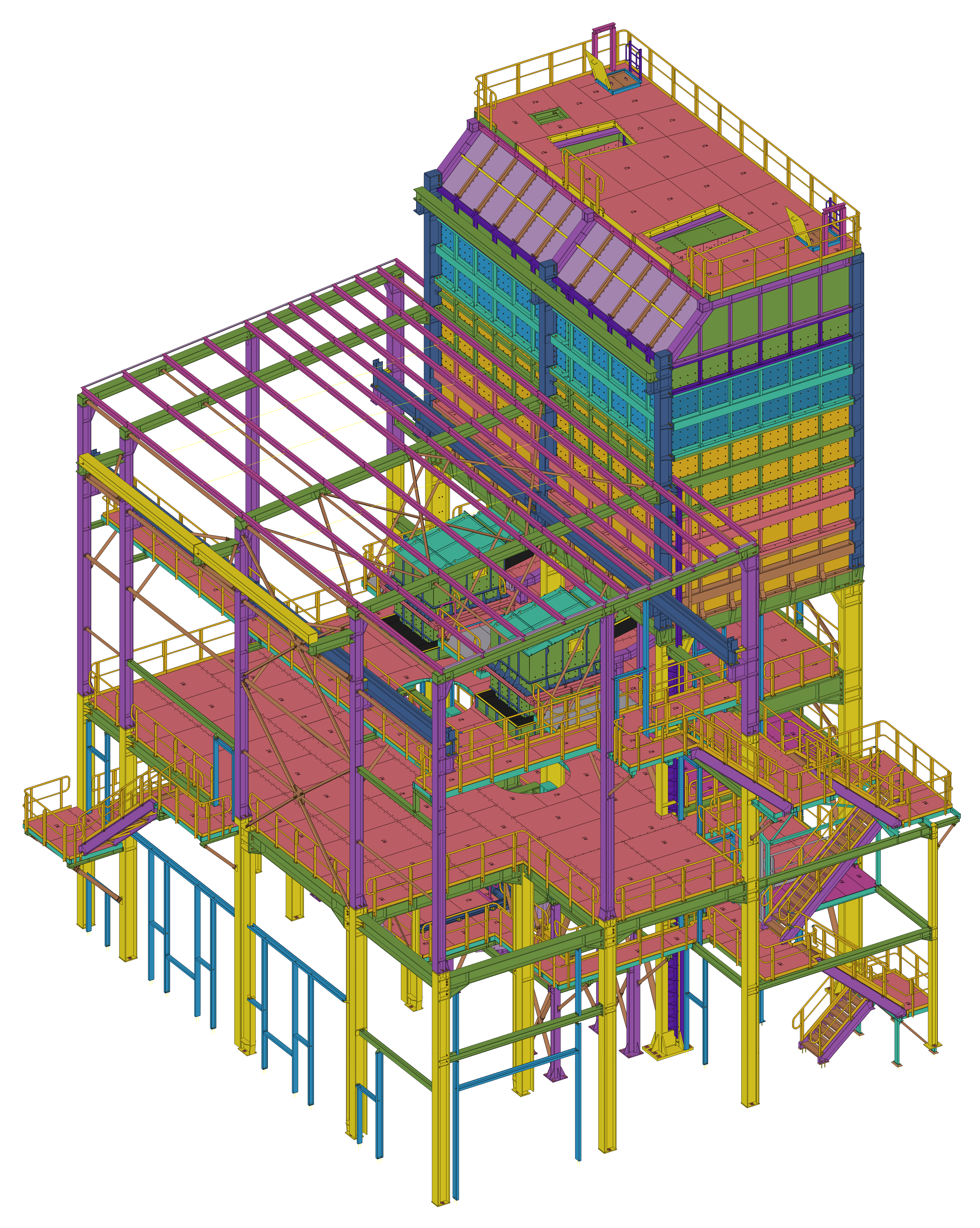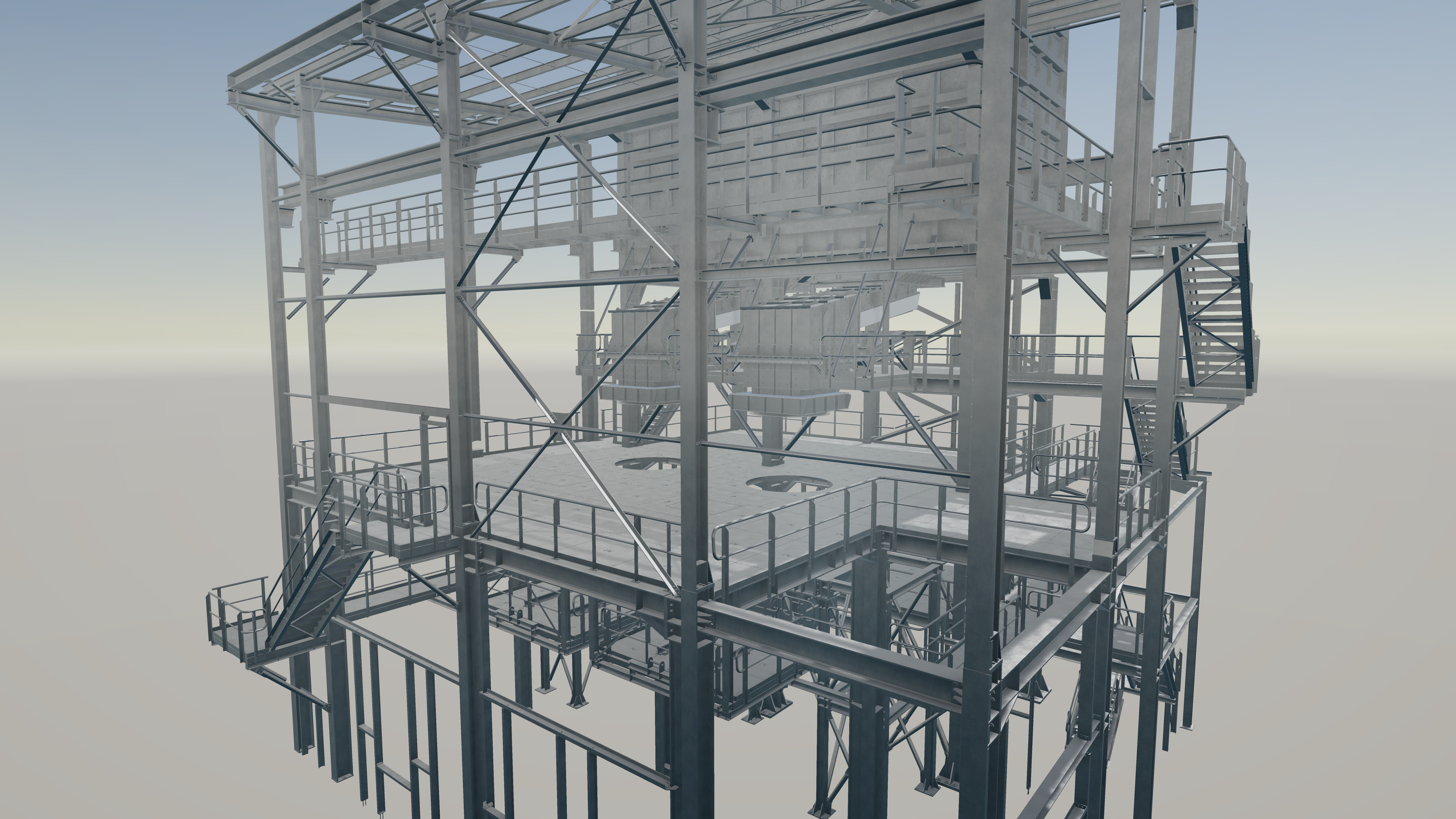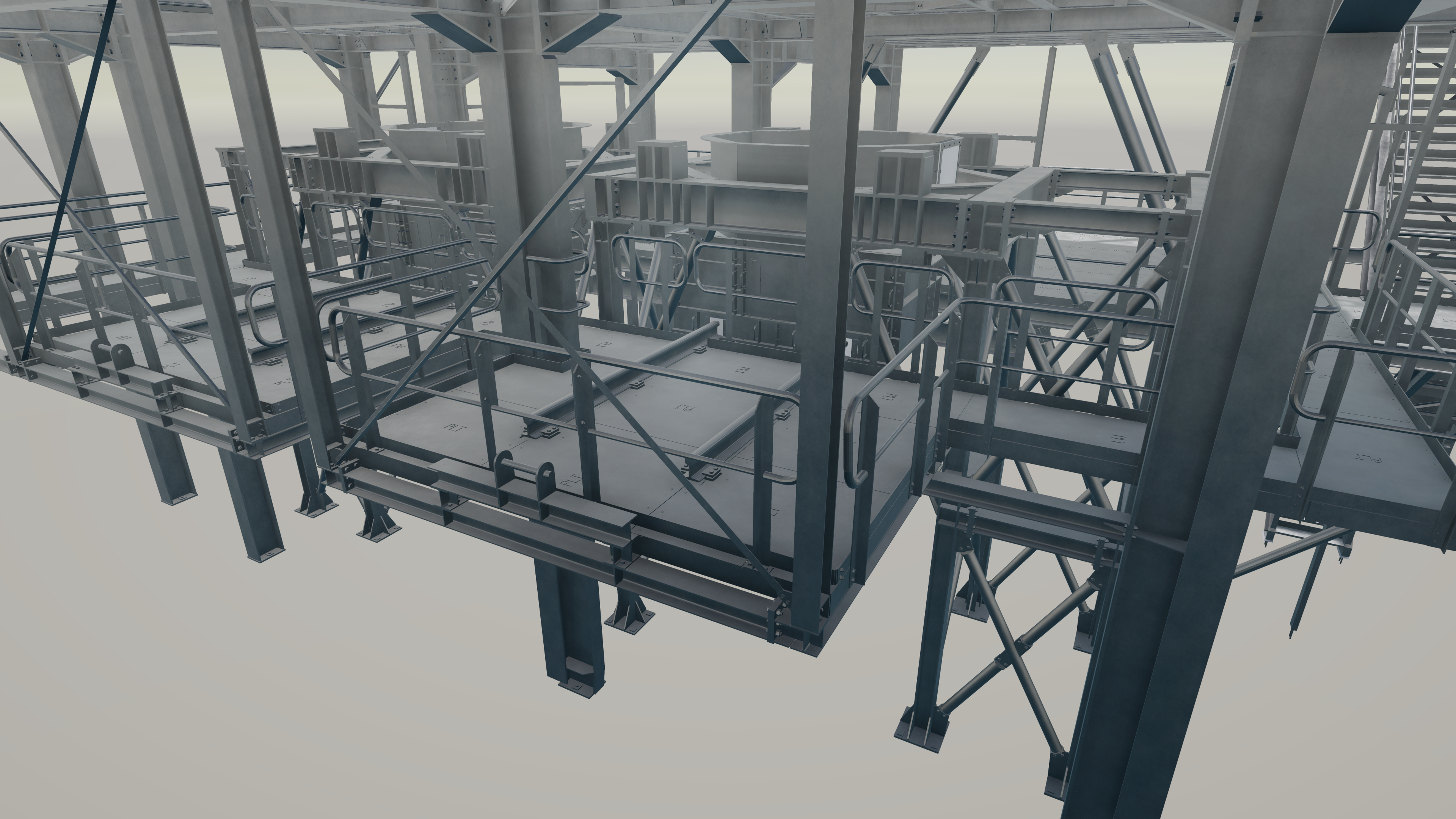 The project area of the gravel plant in Tau, Norway, includes several facilities. Work on the project continues, but one of the structures already completed is the Secondary Cruhsing Building. The project included a steel counterstructure with chutes and aggregate tanks protected on the inside with hardox steel. The dimensions of the building in plan are about 20×20 m, and the height is 25 m. The weight of the building is about 500 tons. The building will house crushing plants. The model was created in Tekla Structures, and collaboration with the designers and the fabrication shop was done using the Trimble Connect platform, while project coordination was done on the Dalux platform.