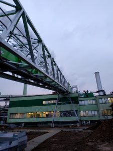 Zakres opracowania obejmuje wykonanie projektu warsztatowego stalowych konstrukcji obiektów przemysłowych wchodzących w skład planowanej rozbudowy instalacji dozowania paliw alternatywnych w cementowni Górażdże Cement S.A. w Choruli. Stacja dozowania, stacja separacji, stacja przesypowa – przestrzenne konstrukcje słupowo-ryglowe. Most przenośnikowy – dwuprzęsłowa kratownica przestrzenna o schemacie belek swobodnie podpartych, przegubowych. Estakada rurociągów transportu pneumatycznego – dwie konstrukcje wsporcze złożone z podłużnic i poprzecznic oparte zarówno na nowoprojektowanych jak i istniejących obiektach. W zakres projektu wchodziło również wyposażenie projektowanych obiektów w konstrukcje wsporcze, pomosty robocze, balustrady, drabiny, itp. Stworzono dokumentację składającą się z: list materiałowych, rysunków pojedynczych oraz wysyłkowych, dokumentacji montażowej obiektów, ale również plików .nc i .stp, które zostały wykorzystywane w warsztacie stalowym podczas produkcji na zautomatyzowanych liniach do cięcia i wiercenia profili stalowych za pomocą maszyn CNC celem przyspieszenia całego procesu.