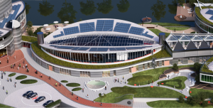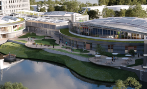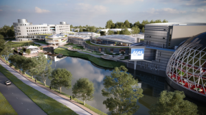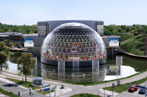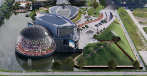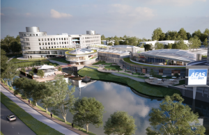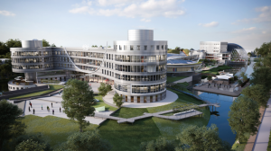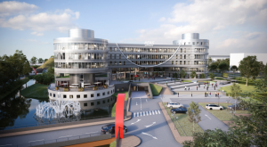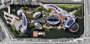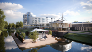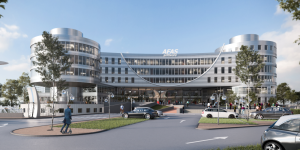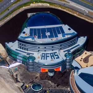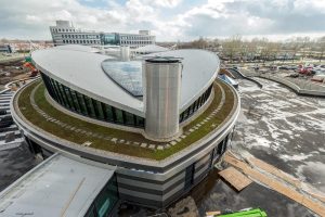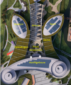 The new construction of the AFAS Experience Center, located near to the headquarters in Leusden, has a remarkable design, which is originating from the architectural firm Steef van der Veldt. According to AFAS the design shows ‘vision, ambition and courage’. Seen from the sky, the construction project resembles a flower, thanks to the round buildings and the green surroundings. The complex consists of a main building, side buildings, a restaurant, a theatre and an underground parking garage. All the buildings are connected to each other. Surrounding the complex is a park-like garden with a pond and a hill on which you can sit. The underground parking garage will have 2 floors and can accommodate 760 cars.