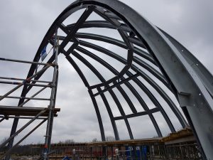 The main building also has a self-supporting facade with an arch span of approximately 40 meters. A kind of pulling-arc-like construction has been designed for the structural implementation of this. The load-bearing columns consist of a double tube B406.4/16 coupled with a 30 mm plate. The bottom line is composed of a fortified HEB1000. An important element of the facade is the decorative tube B406/10, which is situated just a few centimeters in front of the glass facade in a 3D rolled form. Due to the round and complex shape of the facade with minimal deviation, it was decided to build it in its complete form in the factory, to leave no room for mistakes.