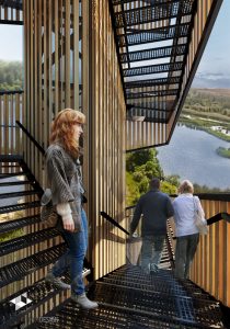 This is the project is a lookout tower designed on an equilateral triangle with an 8 m side. The usable part of the tower’s construction is 12 flights of stairs with a usable width of 125 cm, separated by landings, crowned with a roofed terrace that will accommodate 30 people at a time. The tower has been designed and located so that the view from the terrace opens to the most attractive picture. There is also the possibility of observing the area with landings (on local airport) in each direction.