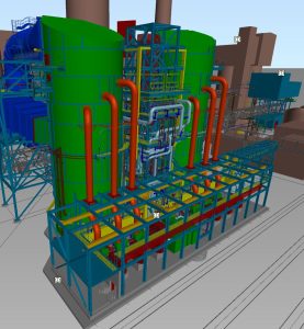 The subject of the contract is statics of connection, project and workshop dokumentation of the new desulphurisation of the Mělník I power plant. In the Tekla program, the complete field of flue gas cleaning was elaborated. Thus, construction of two absorbers with service platforms, pump buildings, stair towers and cable bridge. The difficulty of this project lies in the coordination of many professions in a very short time – basic design, technology, cladding, machinery, secondary construction for electrical and etc.