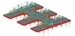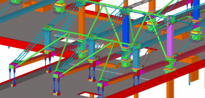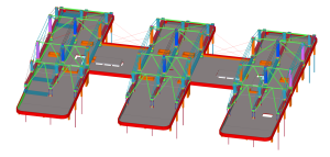 The article deals with design, fabrication, erection and prestressing of steel superstructure of new building Trimaran in Prague. The trio of three trusses supported on a central aisle as simple beams carries on the overhanging ends on one side the suspended four storeys building above ceiling of the conference room and on the other side, as counterweight the three storey administrative building. The steel superstructure consists of 582 tons of steelwork and 257 prestressed tendons Macalloy.