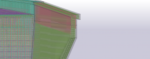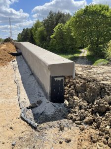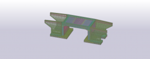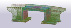 Fundament obiektu został zaprojektowany w kształcie litery “C”, co stanowiło pewne wyzwanie przy precyzyjnym modelowaniu zbrojenia wraz ze strzemionami za pomocą dostępnych narzędzi. Skrzydła natomiast przewidziano jak posiadające zmienną grubość oraz zakończone gzymsami.