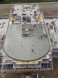 The Project Aertssen in Verrebroek (Belgium) is logistic centre (13ha) close to the harbour in Antwerp. On this site they will finish and assembly the machines. The important thing of this project is the number of warehouses and the office block. De first layers of the office are between the warehouses. The other five floors begins at the rooflevel of the warehouses. The shape of this office block is special. The position of the floors are not in line with each other. Because of this the building is a unique creation.