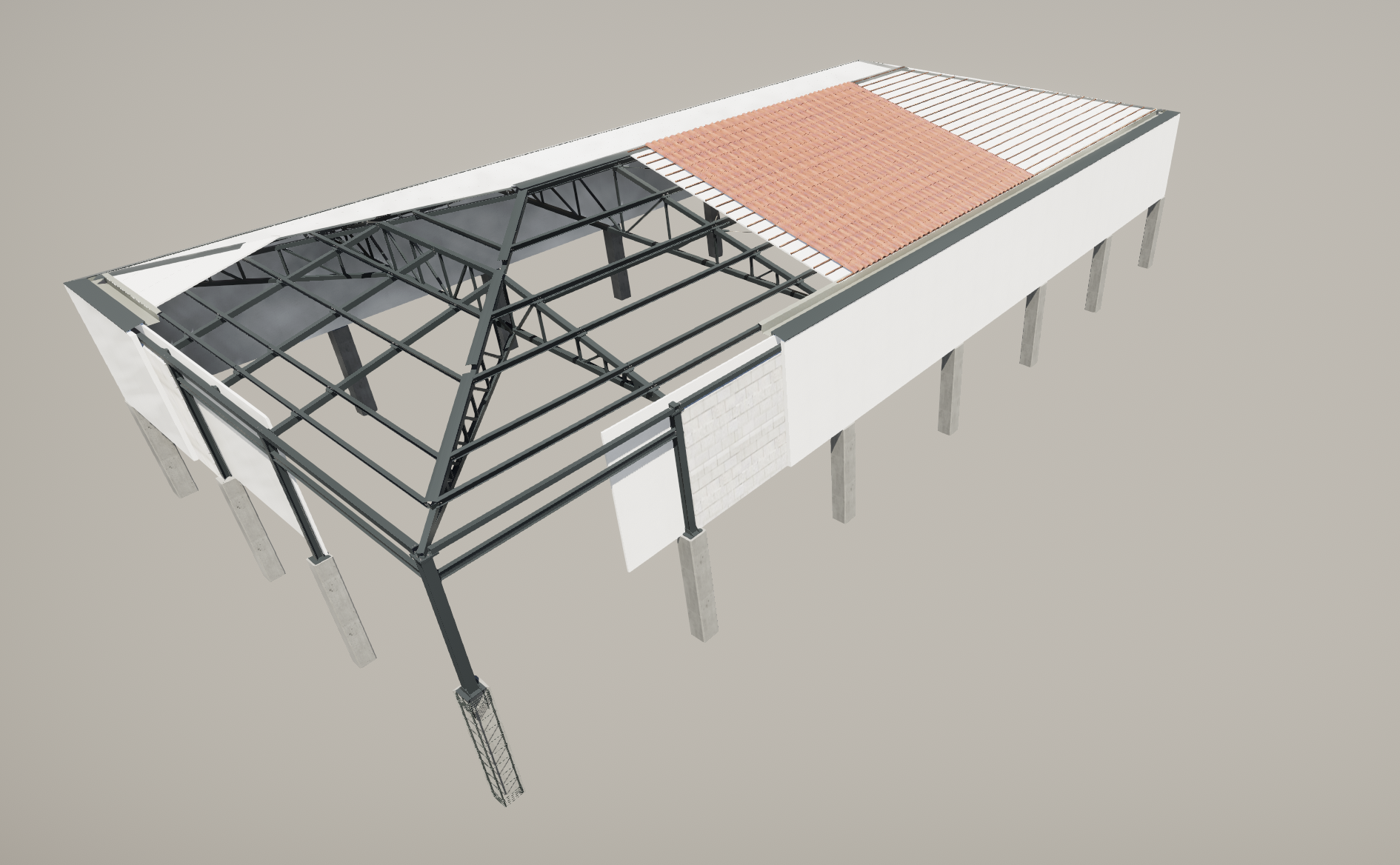 Cubierta a 4 aguas mediante cerchas tubulares de 15m de luz, correas de perfiles I y arriostrados con tensores roscados.
