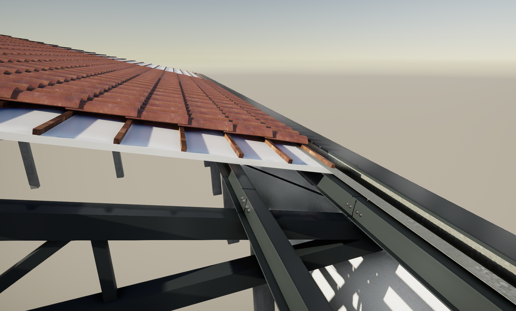 Cubierta mediante panel sandwich con colocación de tejas cerámicas mediante listones de madera fijados al panel.