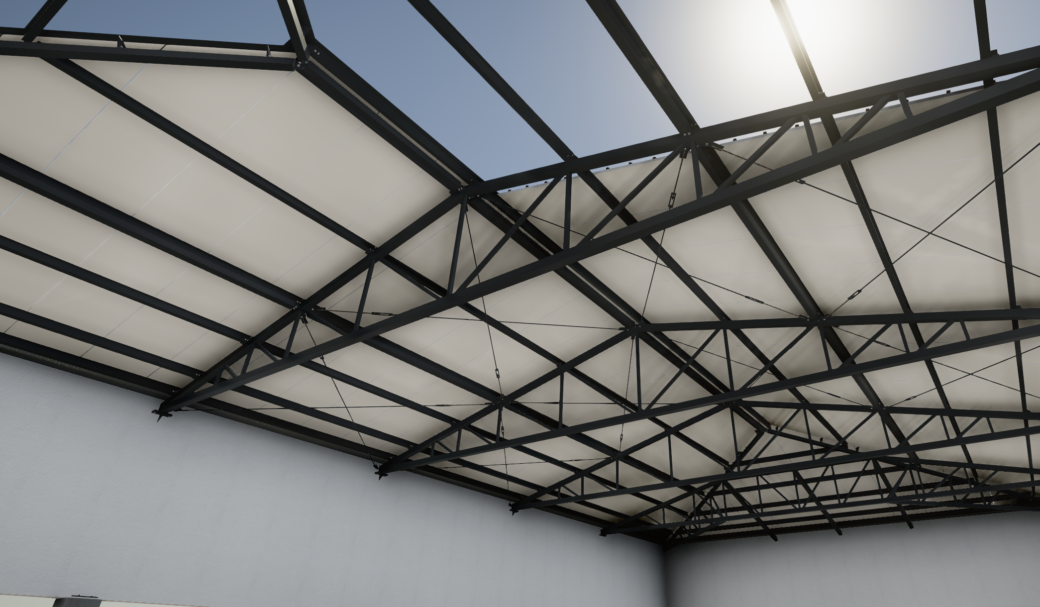 Four-way roof with tubular trusses of 15m of light, I profile purlins and braced with threaded tensioners.