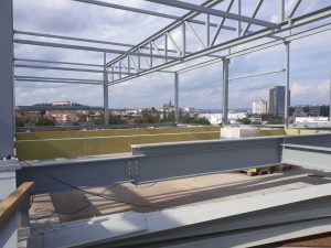 Nadstavba horního podlaží je provedena jako ocelová skeletová konstrukce s obvodovými sloupy z válcovaných profilů HEA a HEB, které jsou kotveny do příčných ocelových průvlaků popř. do stávajících obvodových betonových sloupů.