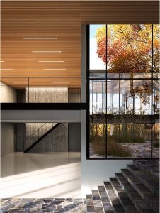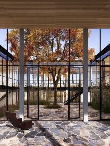 The outer facade of the building consists of a continuous shell of rough, dark-colored masonry, which is interrupted only in three places by life-sized glass surfaces that show in a flash in a spectacular way where the building is located. All facades around the patio are glazed, with double-opening doors on the ground floor and double French windows on the floor.