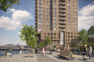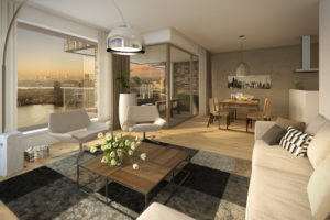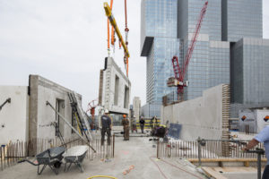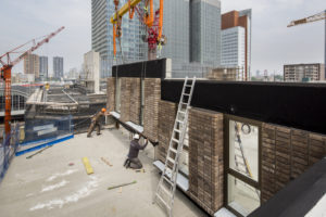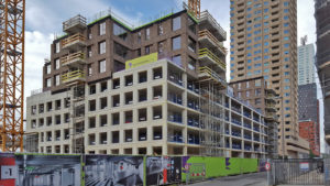 The building consists of two residential towers: Boston and Seattle. In addition to 220 apartments and 1,500 m2 on the ground floor dedicated to stores and food service establishments, the building features private parking for residents and a subterranean public parking structure with two levels. Completion is scheduled at the end of 2017. Since April 2016 the subterranean public parking structure is in use. The basement is a composite steel and concrete framed structure. The towers are made up of concrete. The facades consist of almost 800 prefabricated concrete bearing elements and are engineered by us. These elements contains the stones, bearing concrete wall, window frames, insulation, electra, everything ! Maximum element weight 19 tons. With precast concrete elements we can build faster and with higher quality. For the architect, the appearance of the stones was very important. The element structure may not be visible. The air and water density poses high demands on the detailing. See for more information www.boston-seattle.nl