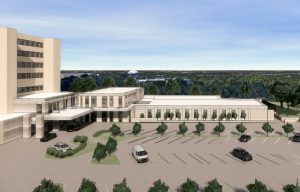 Na wschodzie obiektu znajduje się dwukondygnacyjny łącznik z istniejącym budynkiem szpitala.
