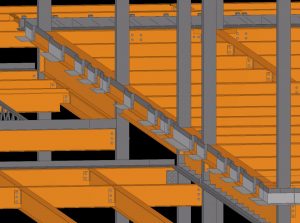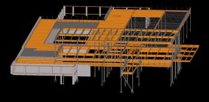 Całkowity ciężar elementów stalowych to 116 ton. Mamy tu 294 belki, 58 słupów oraz 24 stężenia. Wokół całego drugiego piętra zamodelowaliśmy wieszaki pod oblicówkę, spawane do belek na warsztacie.