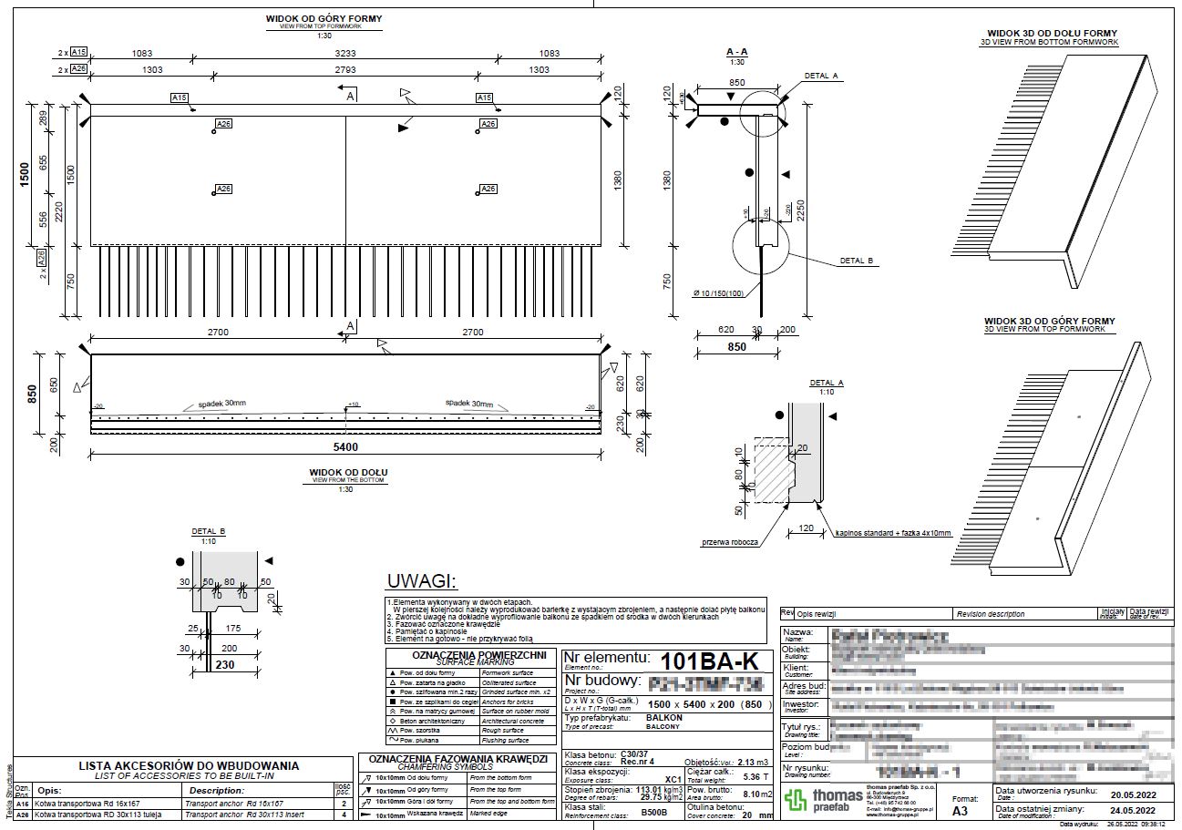 Unusual design of a single-family residential building. Modern architecture and innovative spray insulation technology allowed the creation of a unique building made of prefabricated elements with external single-layer walls. A two-story building with two composite ceilings of the filigree type. Among other things, the project included a projecting section of the ceiling above the ground floor as a cantilever with a span of almost 3m. Above the first floor, beyond the outline of the walls there are overhanging concrete attic beams , which were anchored in the filigree ceiling.