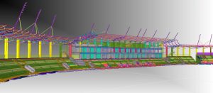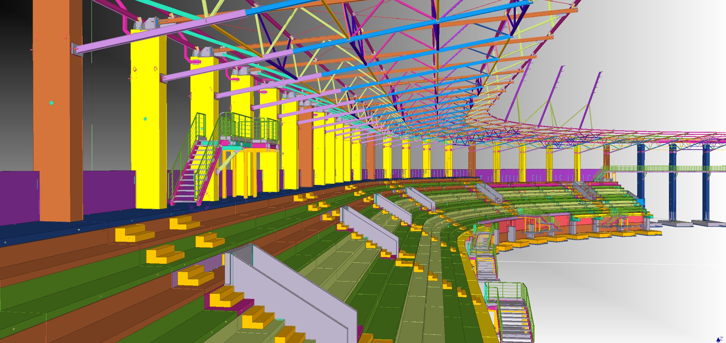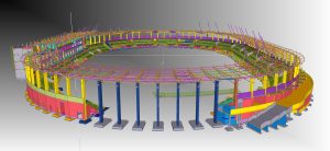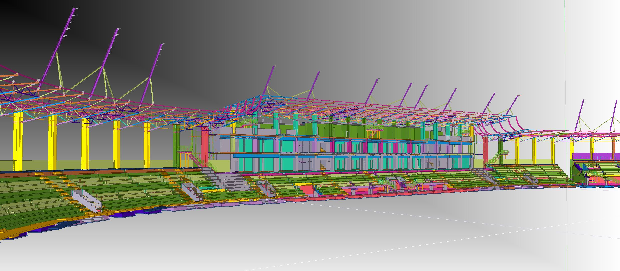 The structure is founded directly on reinforced concrete footings, strip foundations, and foundation slabs cast in situ. The main structural elements of the stadium have been designed using precast reinforced concrete components. The load-bearing structure consists, among others, of columns, toothed beams, and prefabricated grandstand elements. The gallery slab surrounding the stadium, as well as the slabs of the club building, were designed as monolithic reinforced concrete structures.
