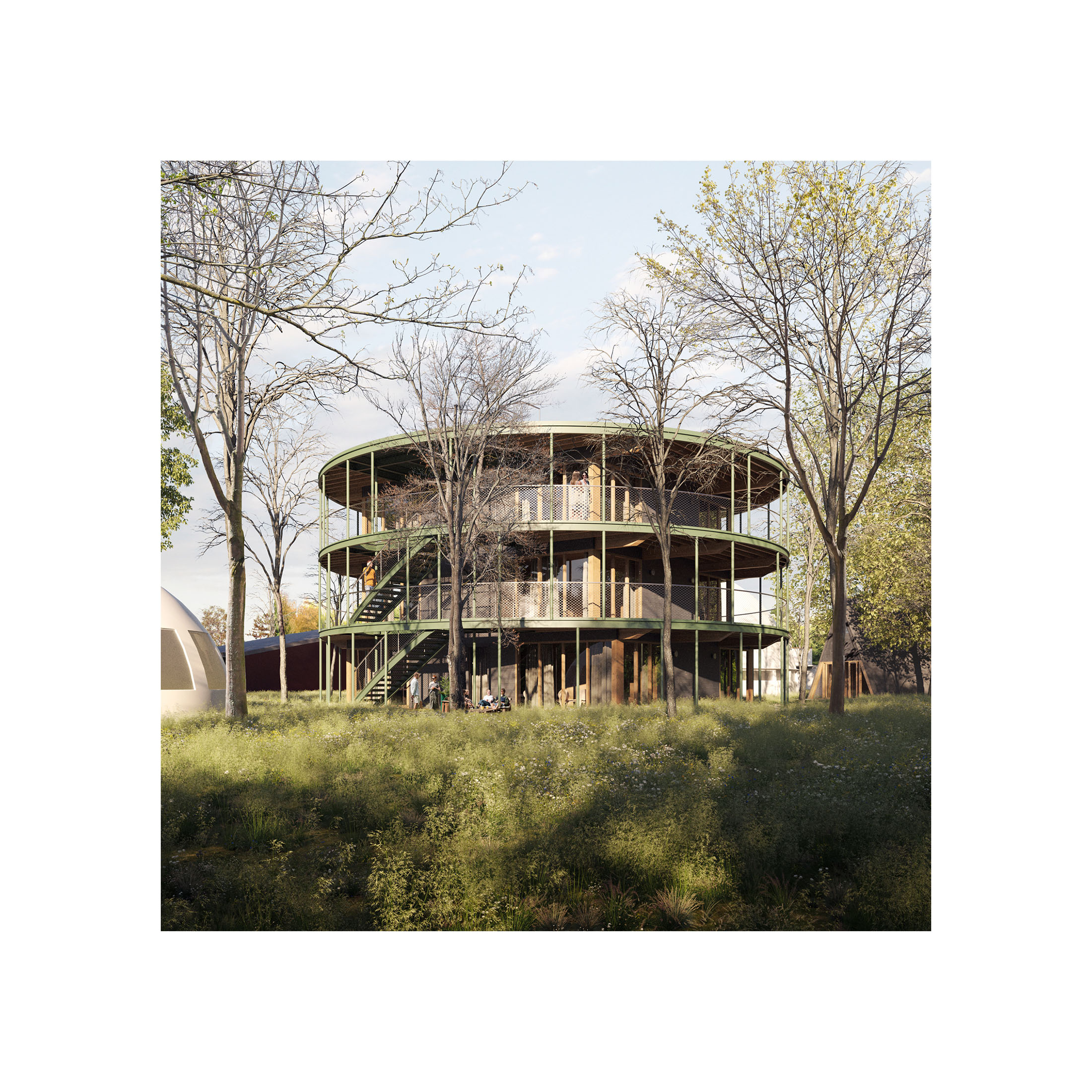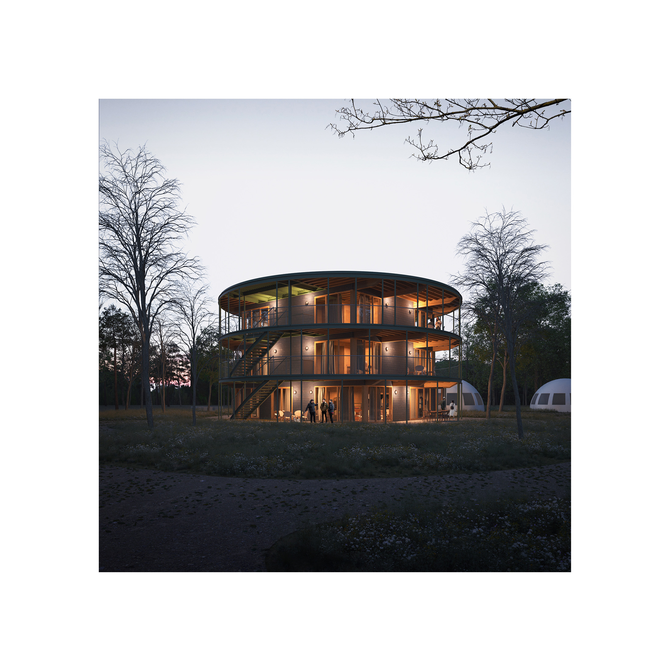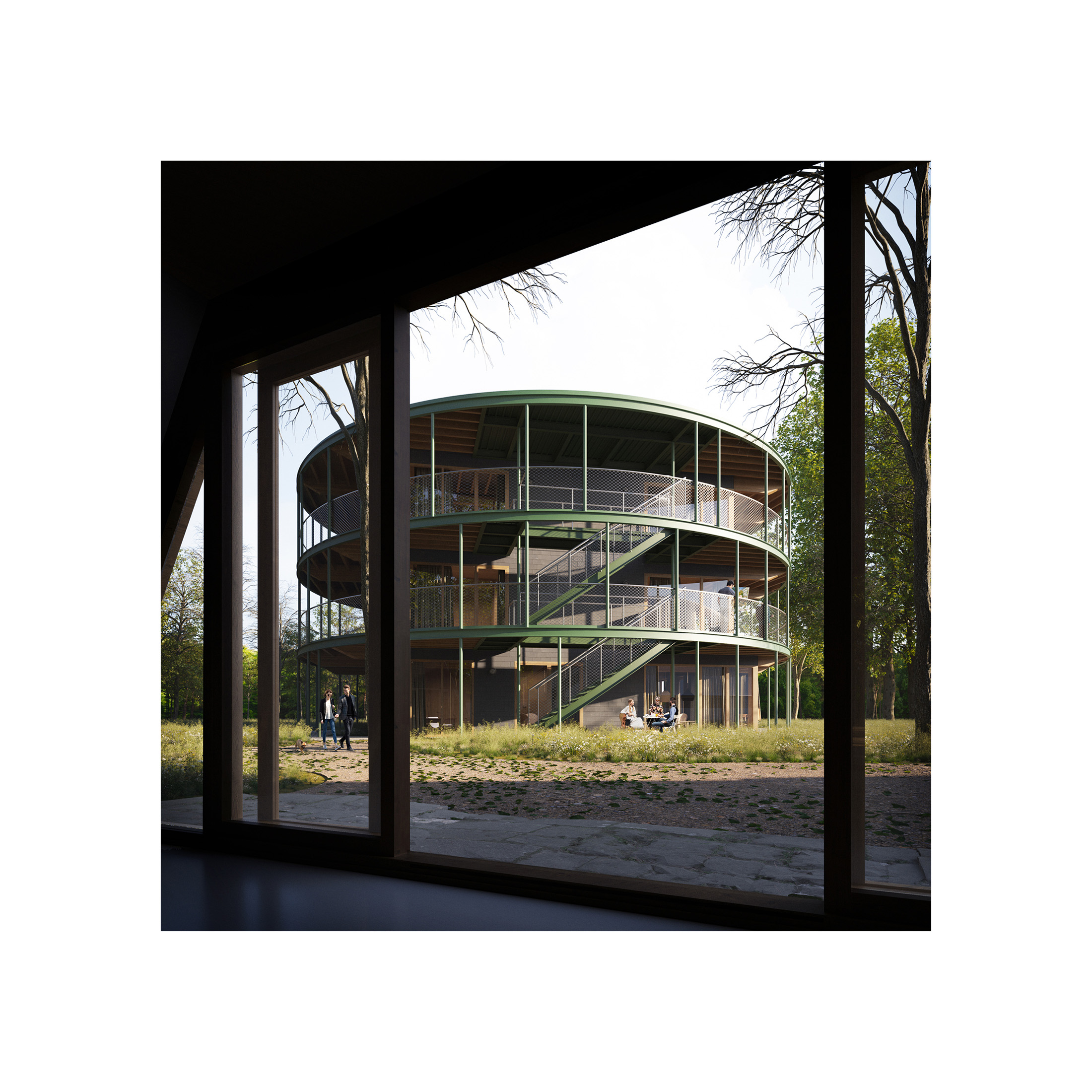 Het nieuwe gebouw van het Frans Masereel Centrum vormt de verbindende schakel tussen vier bestaande circulaire gebouwen in een bosrijke omgeving in Kasterlee. Het gebouw volgt een kronkelend pad dat een dialoog aangaat met de natuur, terwijl het tegelijkertijd rust biedt aan de bewoners en bezoekers. Met collectieve voorzieningen op het gelijkvloers en individuele woonunits op de verdiepingen, creëert het ontwerp een harmonie tussen gedeeld gebruik en persoonlijke ruimte. Elke hoek van het gebouw bevat een multifunctionele ruimte met uitzicht op de omliggende natuur, wat zorgt voor een bijzonder verblijfskarakter.