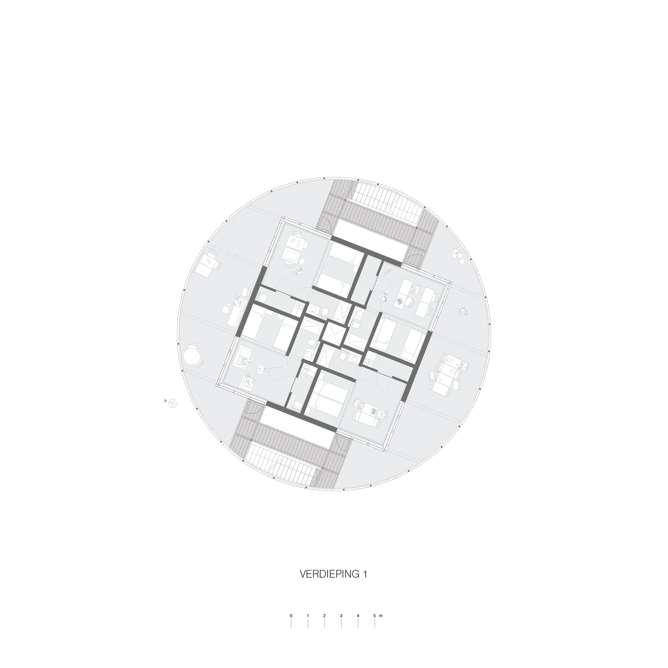 The new building of the Frans Masereel Centrum forms the connecting link between four existing circular buildings in a wooded area in Kasterlee. The building follows a winding path that enters into a dialogue with nature, while at the same time offering tranquility to residents and visitors. With collective facilities on the ground floor and individual residential units on the upper floors, the design creates a harmony between shared use and personal space. Each corner of the building contains a multifunctional space with a view of the surrounding nature, which provides a special residential character.