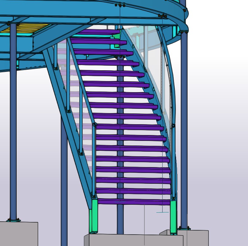 • The complex geometry of the semi-circular stairs, where one stringer is straight and the other curved.
